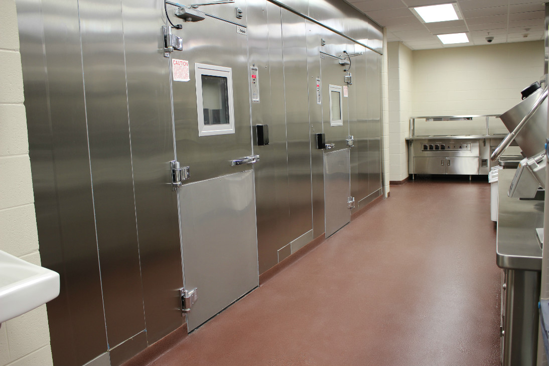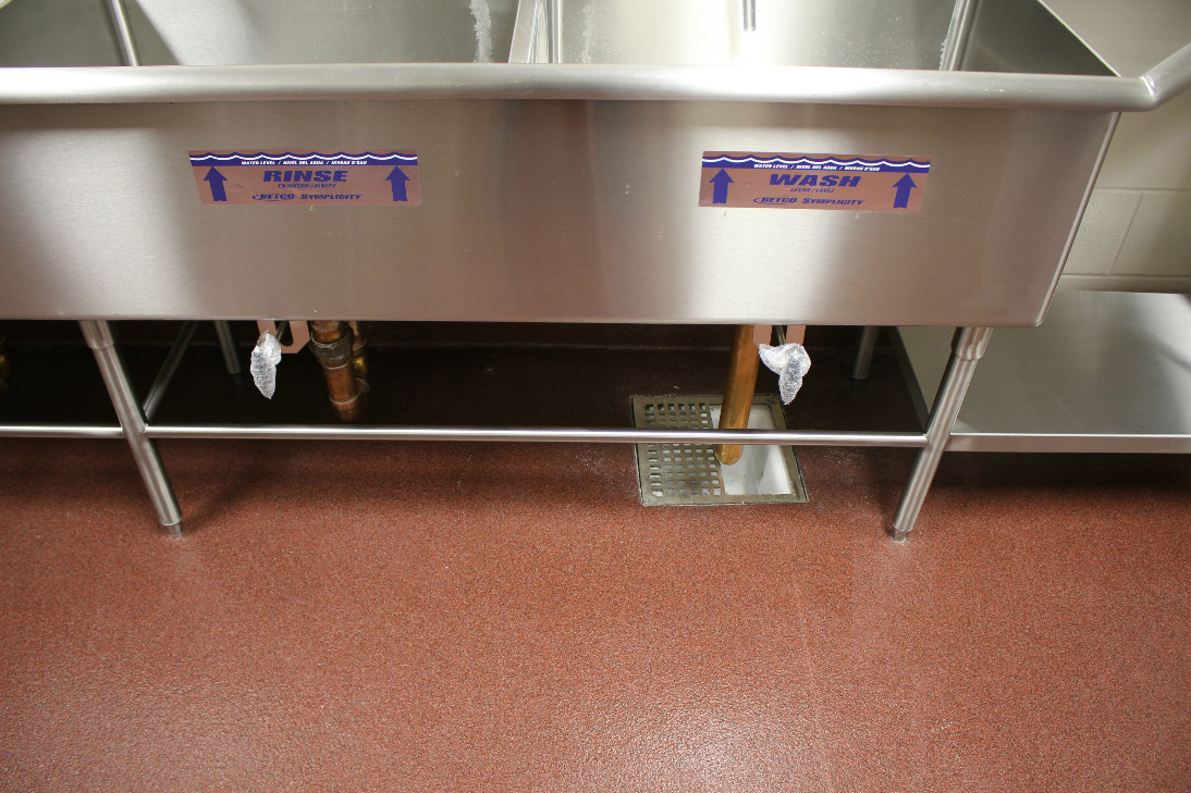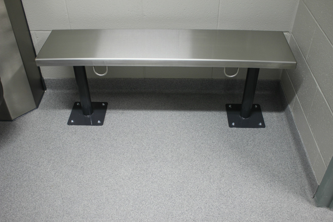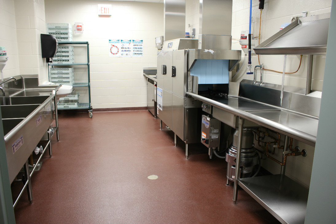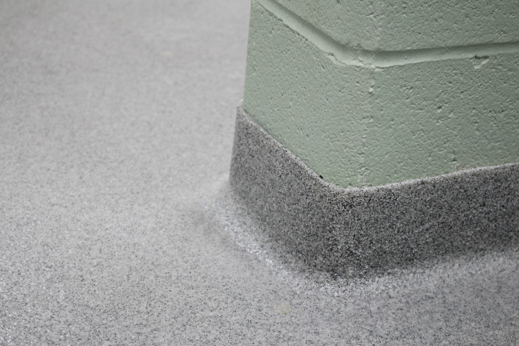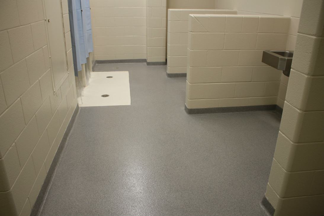 A quartz epoxy coating with integral cove is a sensible flooring solution for spaces that experience heavy foot traffic, water, and require simple maintenance. Integral cove, the trim that connects floor to wall, allows for the room to be sprayed down for cleaning without the worry of mold and mildew growing in the space between the floor and the wall. The seamlessness of the floor will also ensure no dirt or debris will gather in floor cracks and control joints. Quartz epoxy offers slip resistance that meets OSHA guidelines and is commonly used in bathrooms and kitchens, as it was used at Adams County Jail. In the kitchen, the colors of quartz sand that were chosen were red and tan to create a colorful statement against the stainless steel appliances. In the restroom and shower area, black and white quartz sand was used to keep a neutral tone to the space. Overall, 2,000 square feet of our decorative quartz epoxy system and 140 square feet of integral cove was installed at the jail.