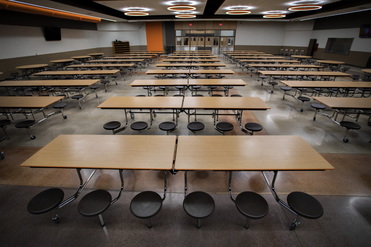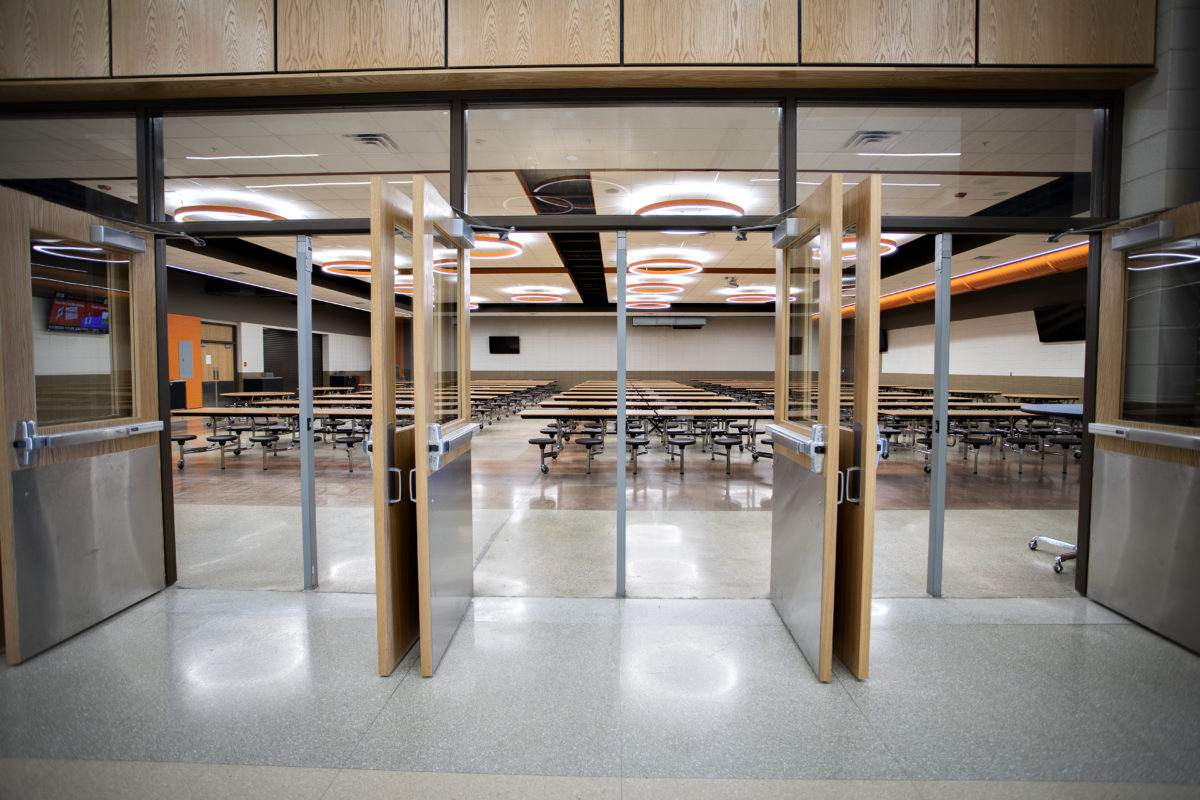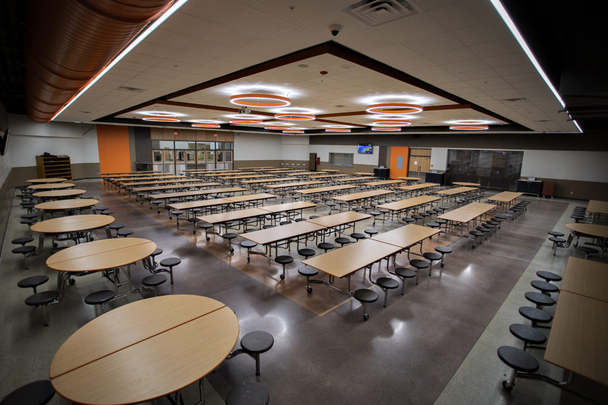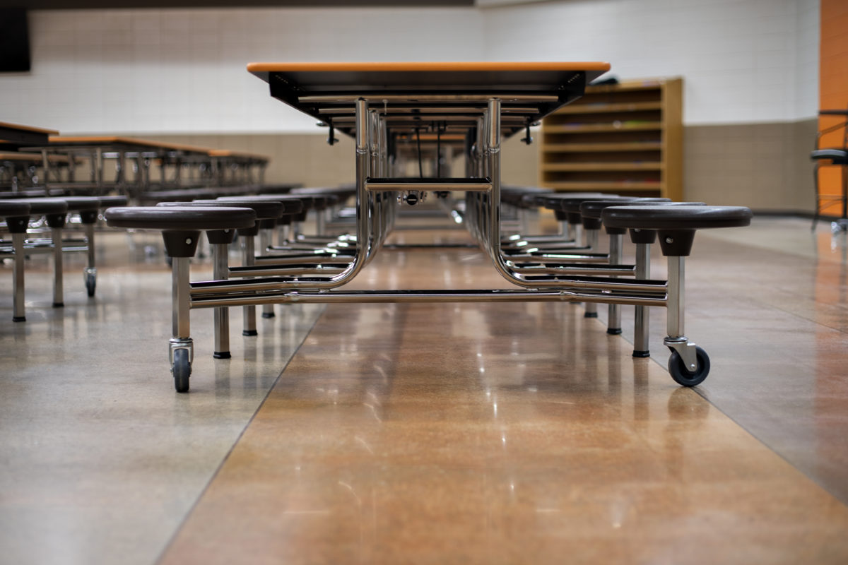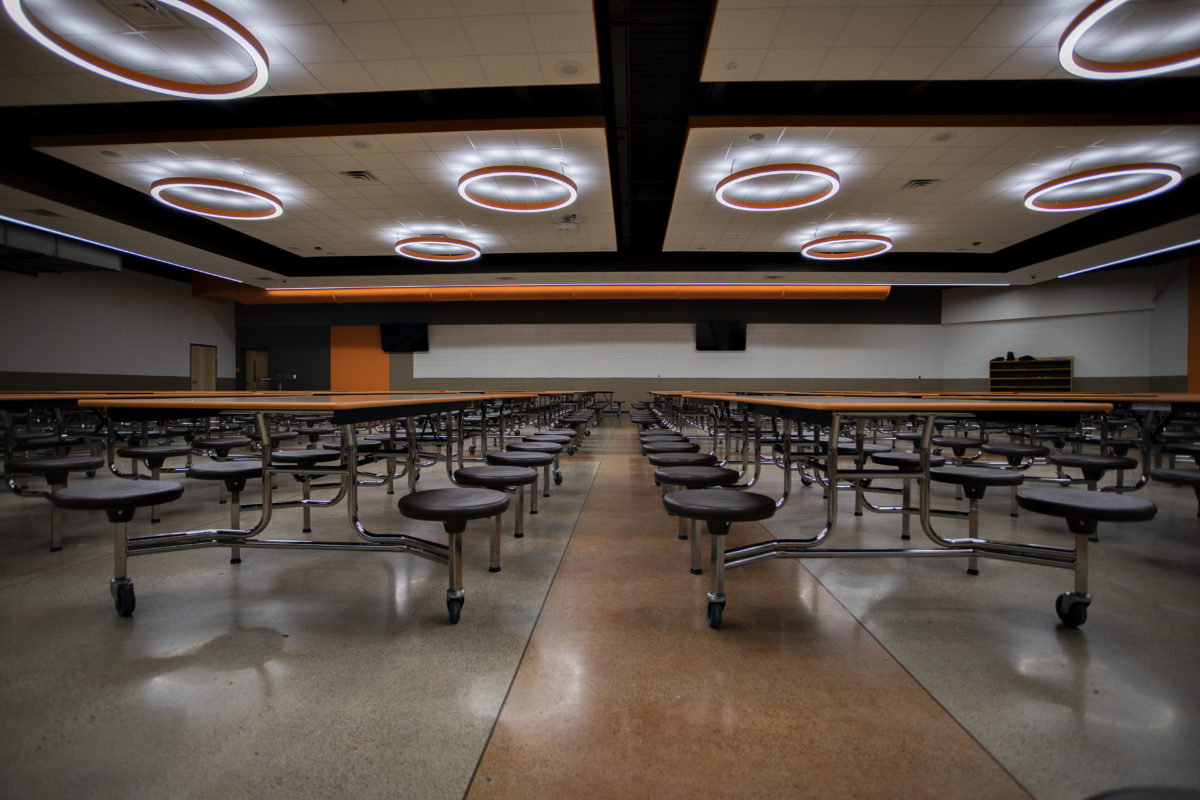 Northrop High School is, home to the Bruins, located in Fort Wayne, Indiana. Recent remodel work turned this Fort Wayne Community School into a space to truly be proud of. The worn-out VCT tile that made up the previous Cafeteria floor was stripped away to reveal the original concrete beneath. Dancer Concrete Design installed our StrongTread Polish – Remodel floor system on the concrete. The ceiling pattern was replicated onto the floor complete with saw-cut joints to enhance the color contrast of the Natural, Walnut, and Raw Sienna dyes.