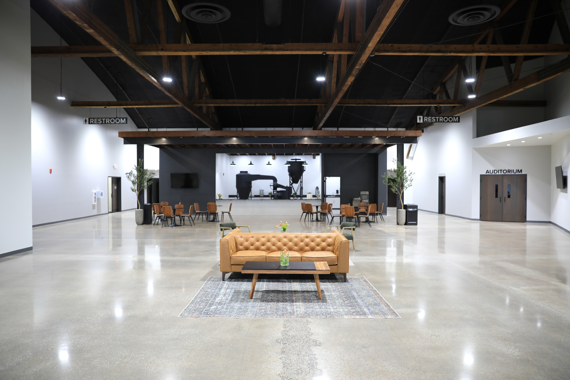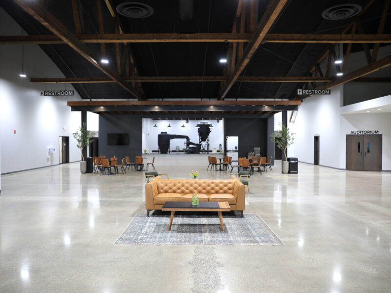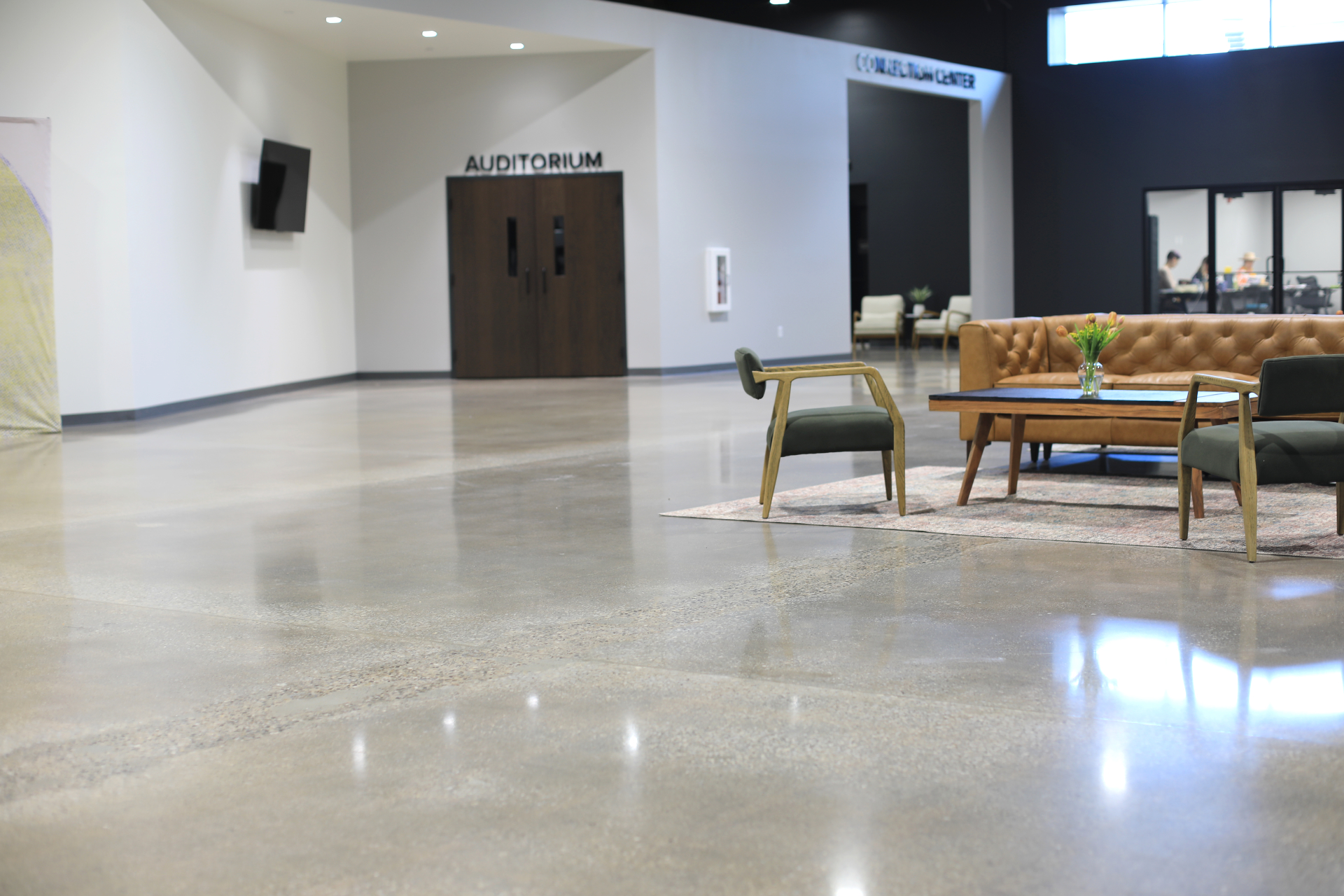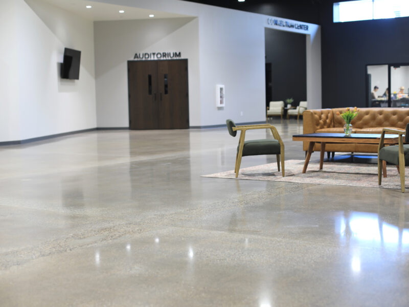 City Church Fort Wayne has opened the doors to their new home base on the south side of Fort Wayne, Indiana. City Church purchased the former Scott’s grocery store to renovate for their growing community, and DANCER polished the concrete floors in the central lobby and gathering space. Our StrongTread Polish – Remodel system was installed on the existing concrete slab, which included extensive patching and grinding to level the floor. A unique characteristic of the floor is a trench, possibly made for the former grocery’s stores data cables, that runs from the front entrance to the open kitchen on the opposite side of the open gathering space. After patching and grinding, the floors were finished to a 400-grit, satin finish.