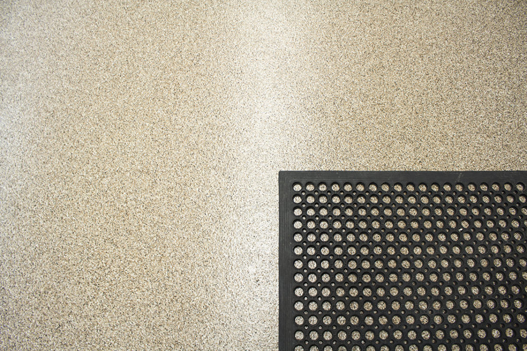 Many clients select our 1/4β chip system, which is also a beautiful and durable option, however, an upgrade to the 1/8β chip seemed to better suit this new remodel. Our Team of was able to complete: closing off old pipes, filling in holes, and patching the floor flush for a seamless coating. The patch spots are now unrecognizable and cannot be seen when one looks over the final surface. The Team also worked around the details of the existing dishwashing equipment that is bolted and welded into place. The final touch to our commercial epoxy floors is always the high-wear urethane topcoat for high-traffic areas. The general contractor on this project completed this space with a new doorway and upgrades on all commercial kitchen appliances to make this space functional and efficient.