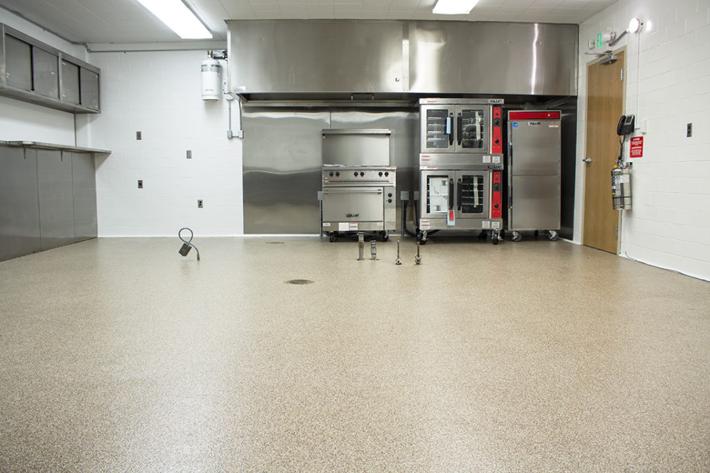 Commercial kitchens require durable materials and finishes in every inch of the space. Along with the heavy foot-traffic they receive, these areas also need to withstand: grease spills, chemicals and cleaners, and hot liquids. The Jewish Temple, Congregational Achduth Vesholom, located in Fort Wayne, Indiana last renovated their commercial kitchen about 60 years ago and plan to make this new renovation last another 60+ years. With this requirement in mind, they knew that flooring materials inferior to epoxy would not fit the bill. We enjoyed stepping up to complete the clientβs list of construction materials which included adding in this durable and slip-resistant 1/8β epoxy chip floor.