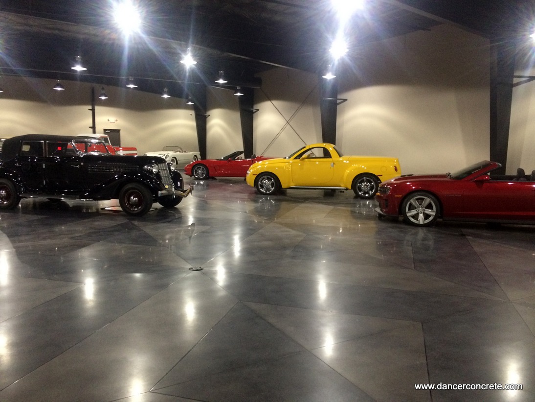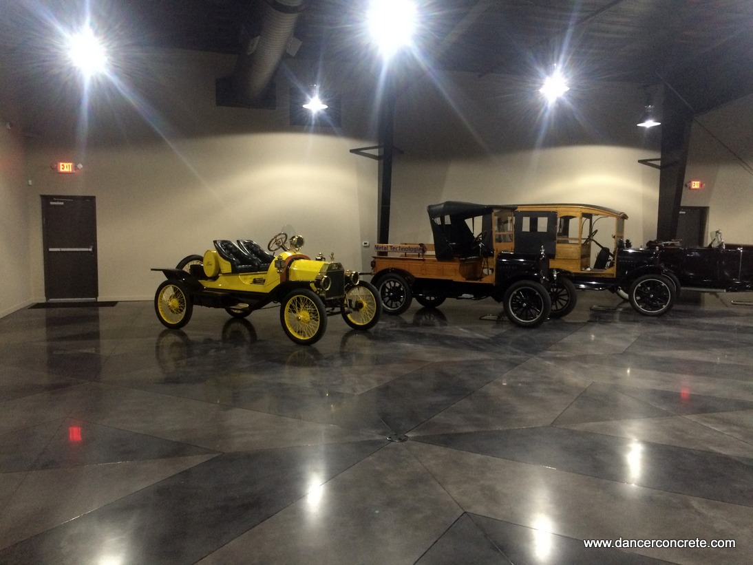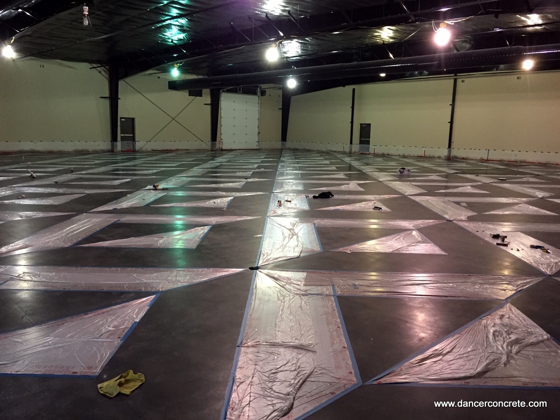 A private commercial client wanted a custom design cut and dyed in the concrete floor in their 10,000 sq. ft. display room. The team really enjoys these kinds of projects because it showcases just how design and durability can go together with a polished concrete floor. The first week on the job we spent leveling columns, joint filling and adding the decorative scoring to the floor. We cut the design ¾” deep and then placed backer rod so the final joint depth was ½”. Cuts and control joints were filled with Black Fox polyurea joint filler before we began the grind and polishing process.