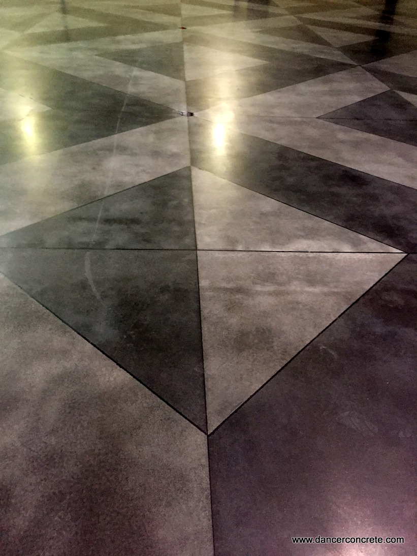 The second week was spent polishing and staining the floor. We used our 32” Lavina polishing machine for this floor and did a number of passes to bring the floor to a 200-grit matte level. To color the floor we used a ratio of 1:4 black penetrating dye and dyed the entire floor. We then rinse the floor and began to tape off the design for the second pass of color. We put down plastic and securely taped the edges of the design based on the decorative scoring we had done the week before. We then applied a second coat of dye. The areas not covered by plastic took a deeper color, which was the intended outcome. The final polish and finish (level one, 400-grit) really finished off the space and highlighted the unique design.