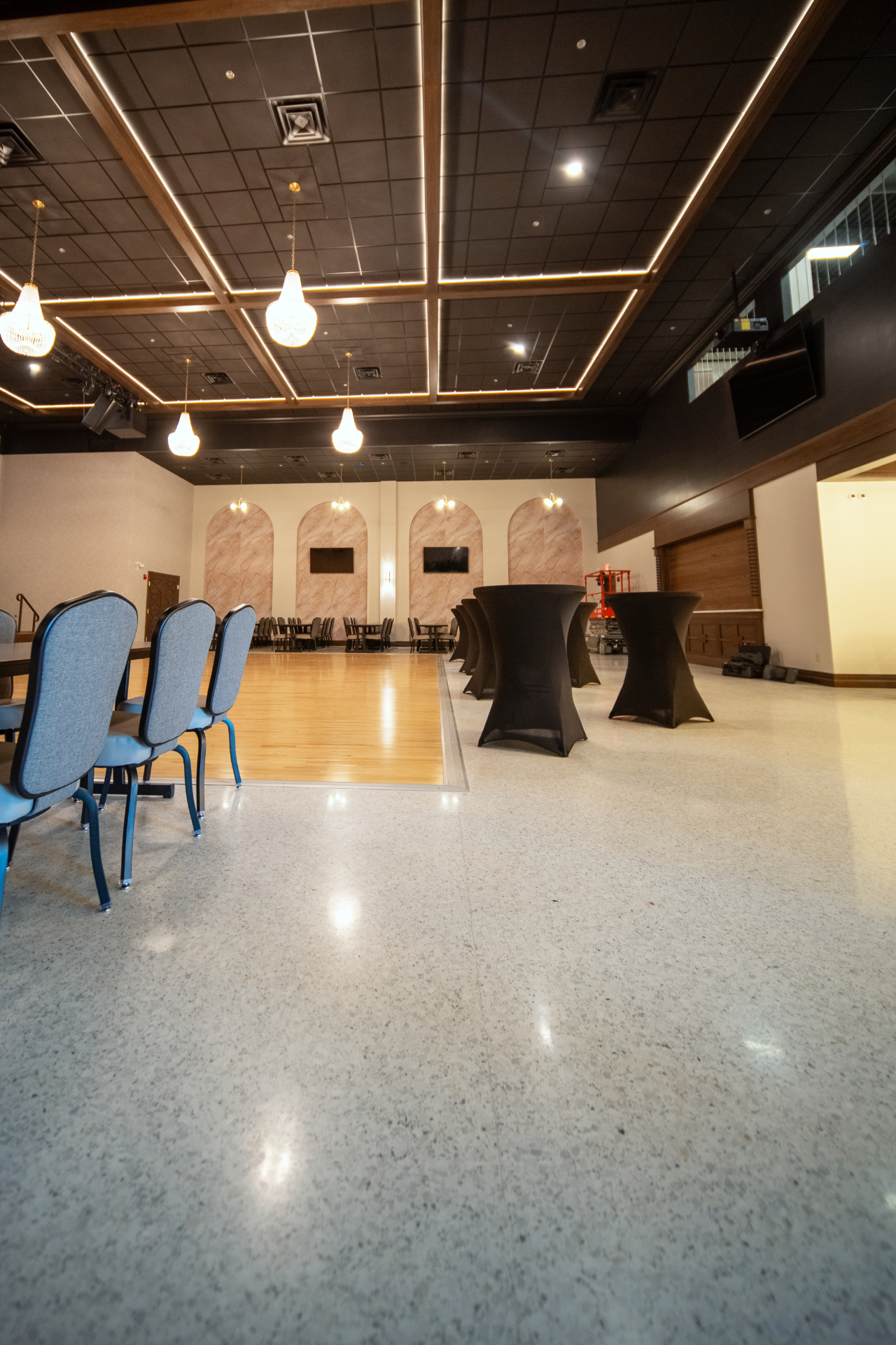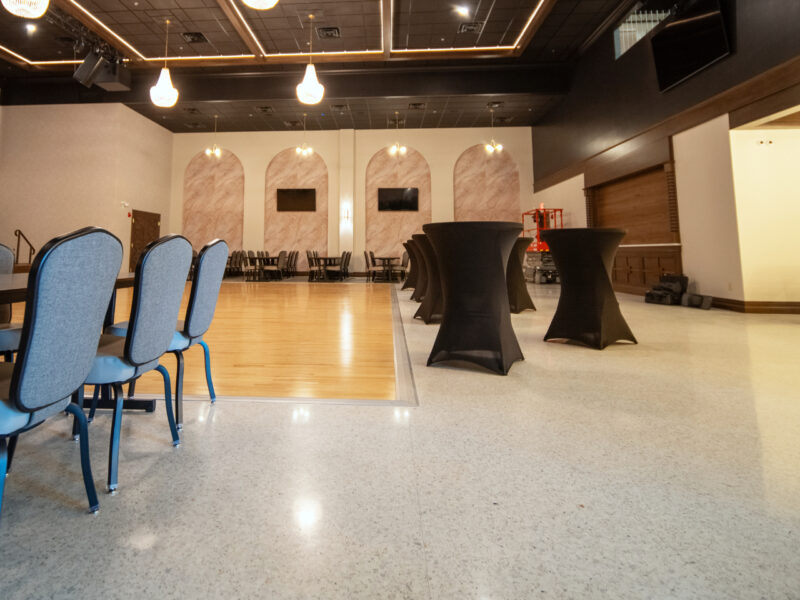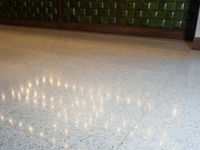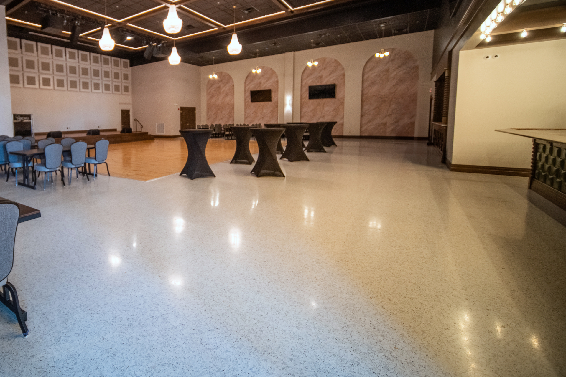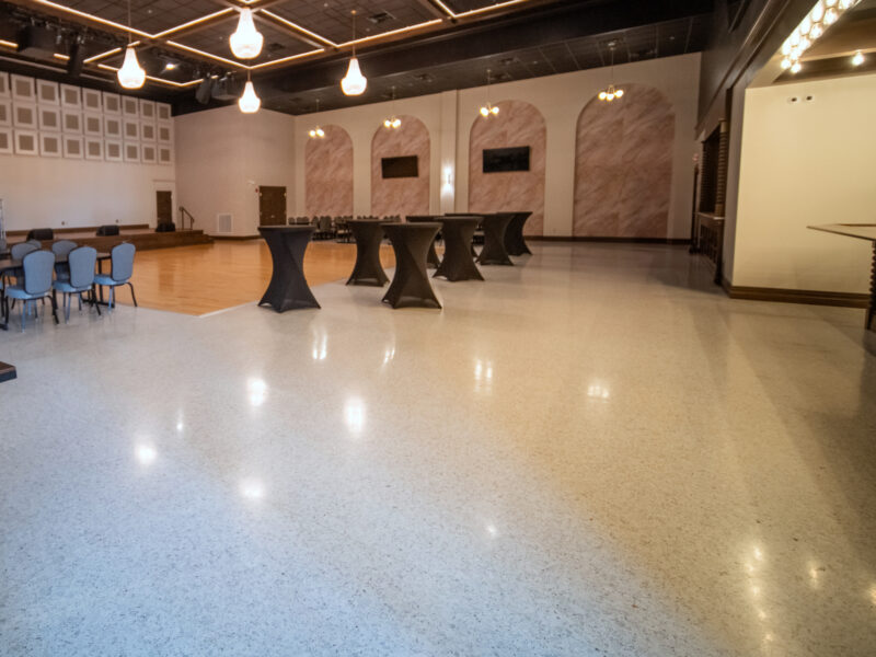 The terrazzo was installed to match the height of the wood, tile, and epoxy quartz flooring. This installation created zero-threshold transitions for the best flow and accessibility throughout the Dance Hall.