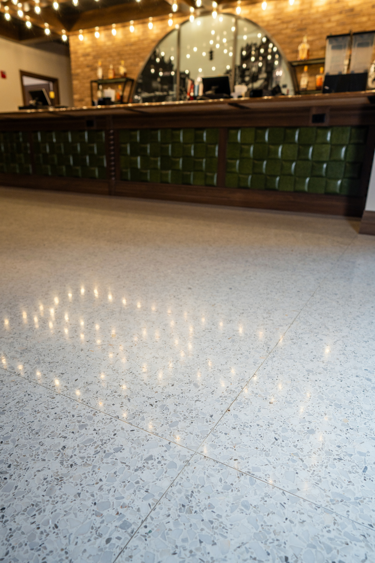 Grab your cowboy hat and polish up those boots, Doc’s Dance Hall and Event Center is ready to teach you how to line dance. DANCER installed terrazzo in the dining area surrounding the dance floor. Doc’s custom terrazzo blend uses five sizes of white marble stones set in a white epoxy matrix with zinc divider strips.