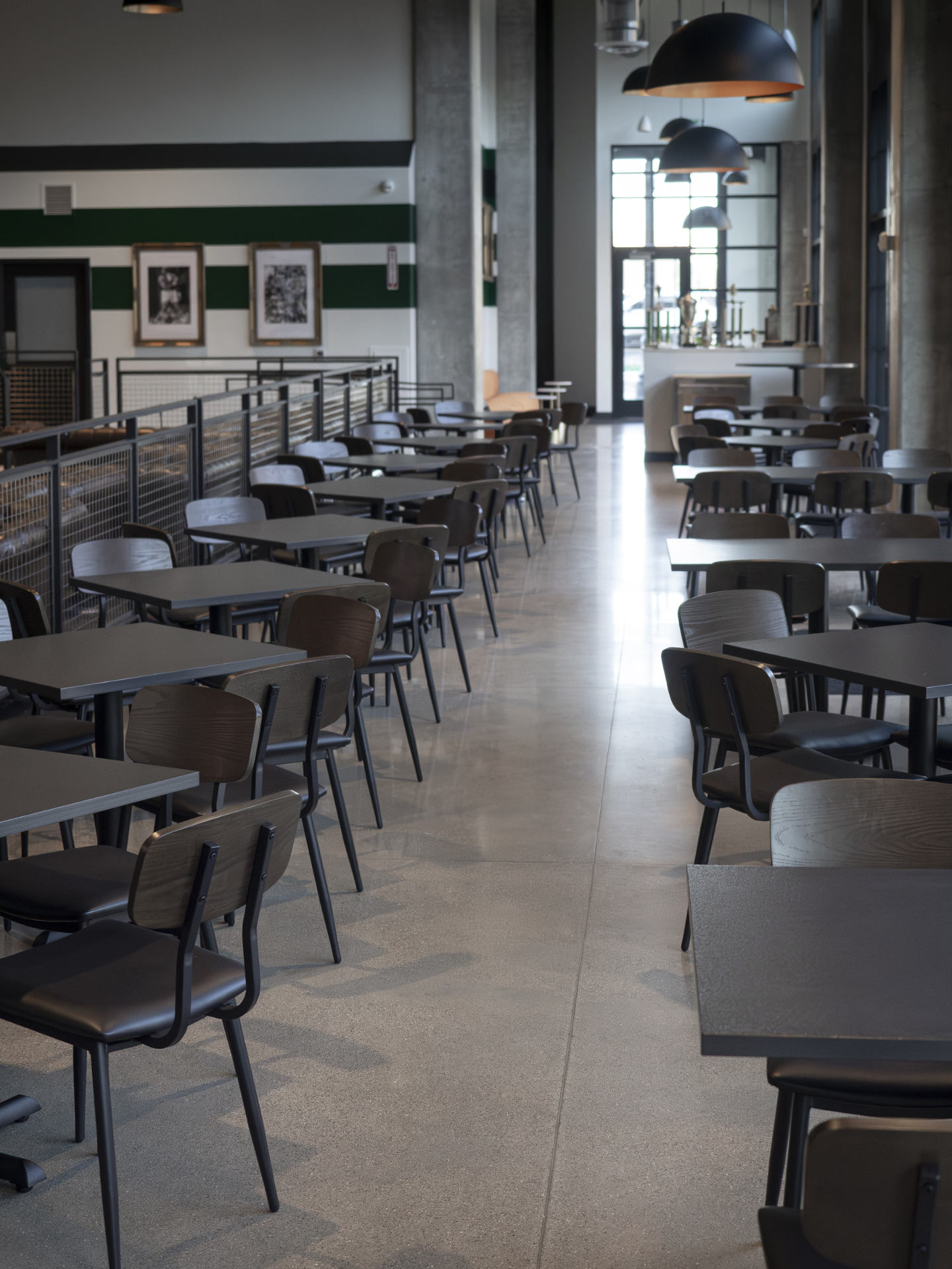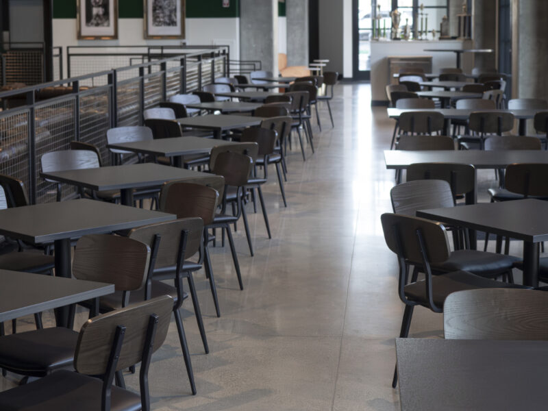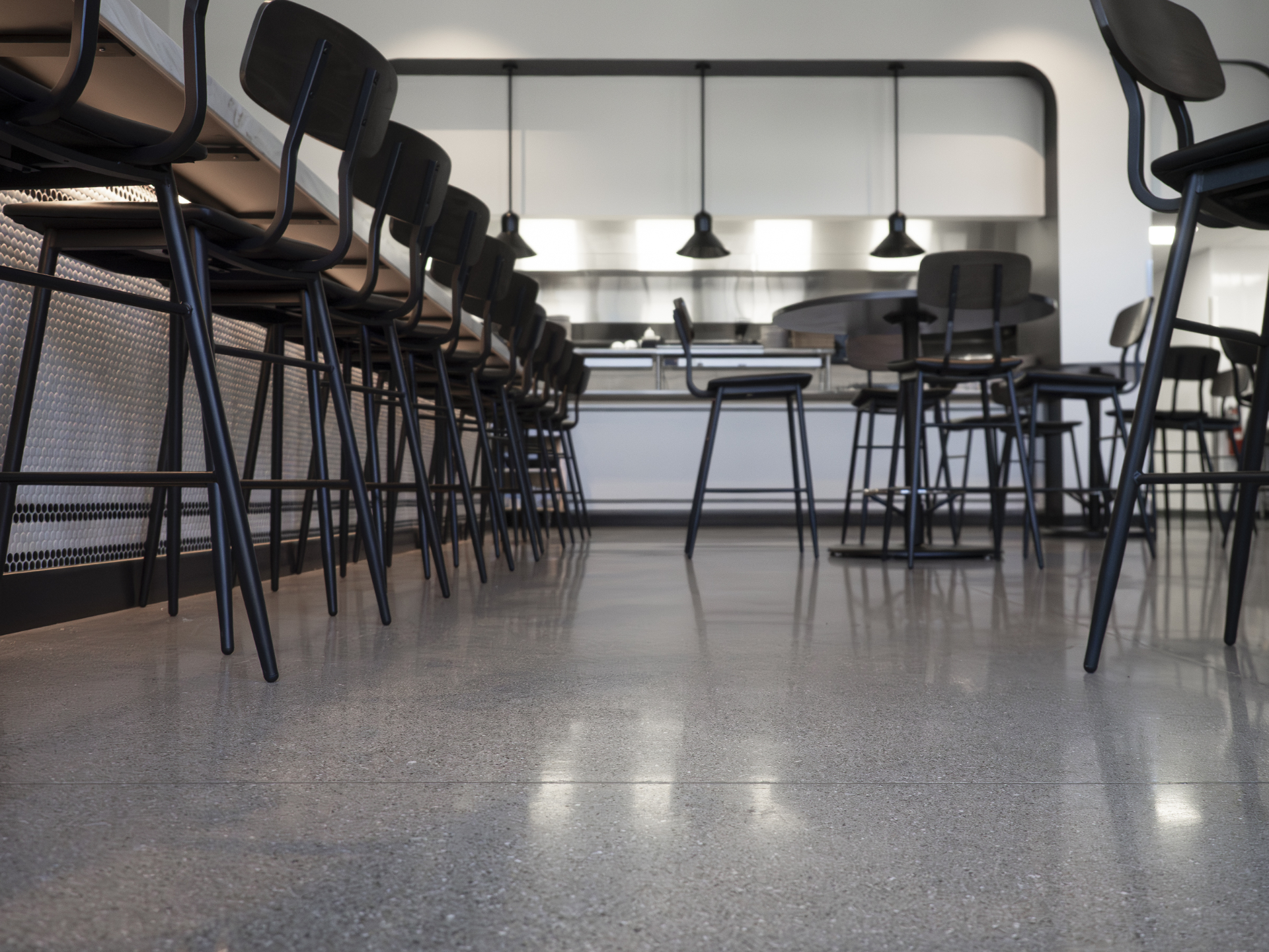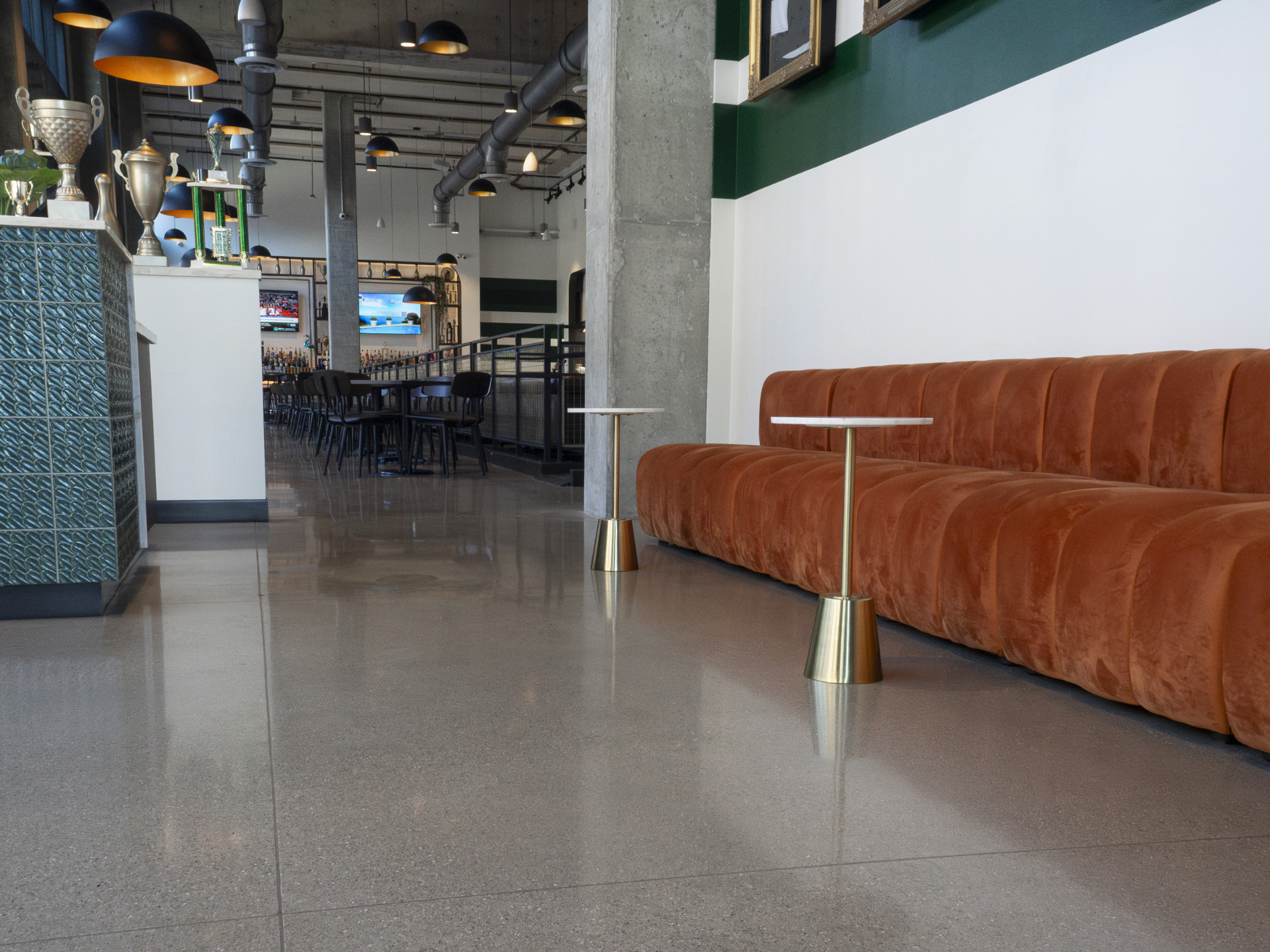 Polished concrete is a wise choice in dining rooms for its durability and straightforward maintenance. For Ducky’s at The Pearl, their project included our StrongTread Classic polished concrete in the dining room and urethane mortar in the kitchen. The polished concrete was finished to a 400-grit satin finish, creating a great base for the restaurant’s wall of windows and modern industrial design.