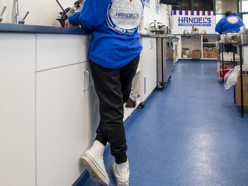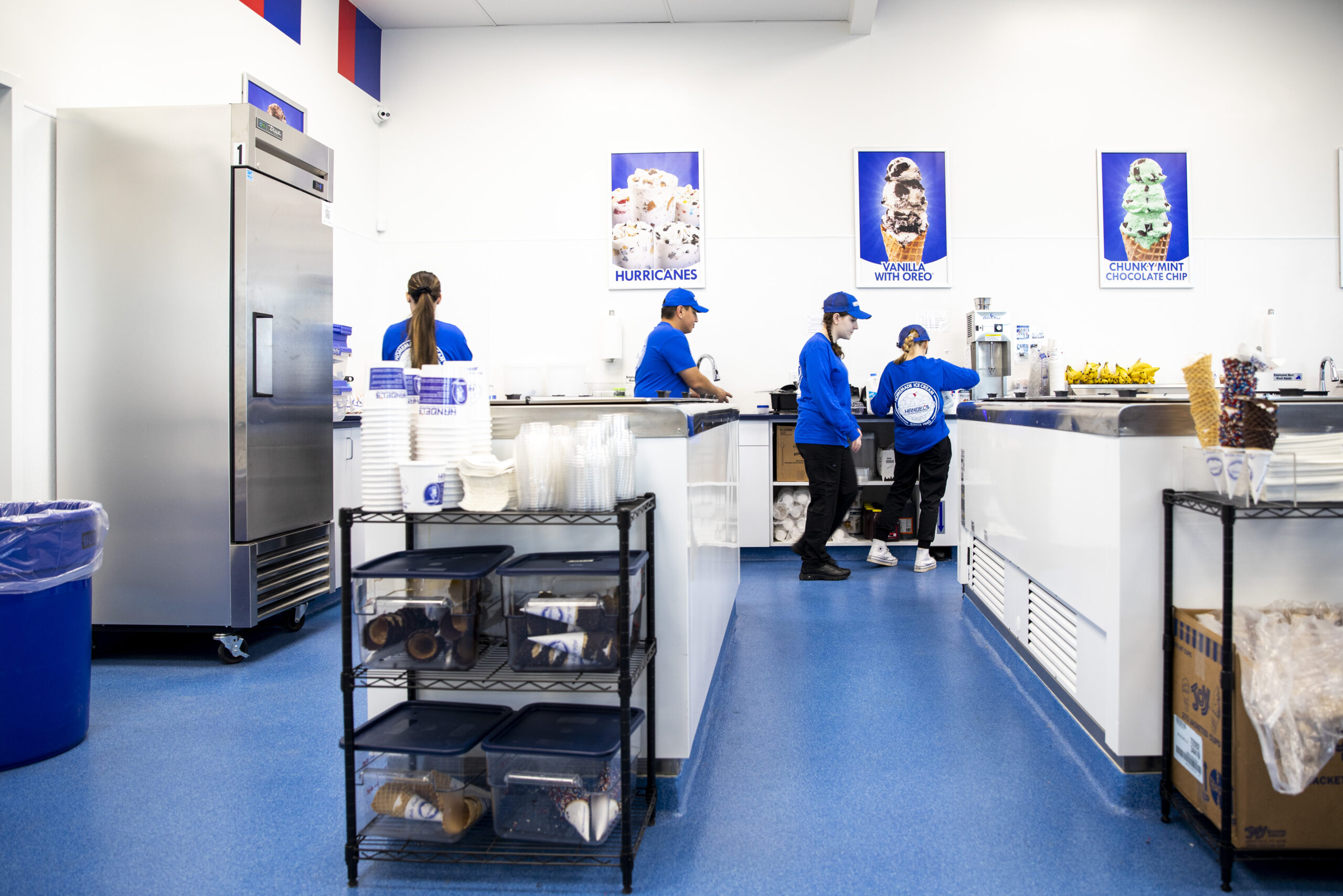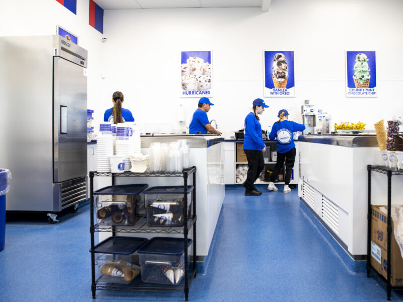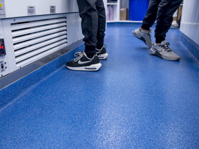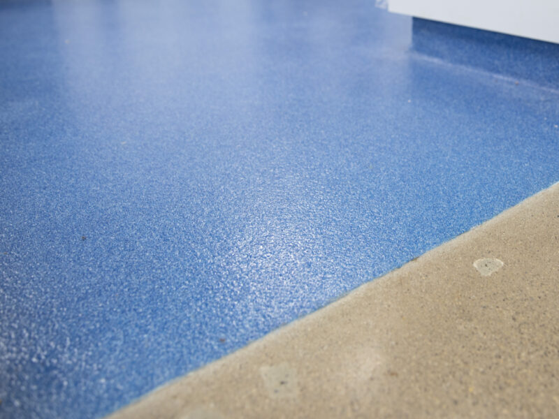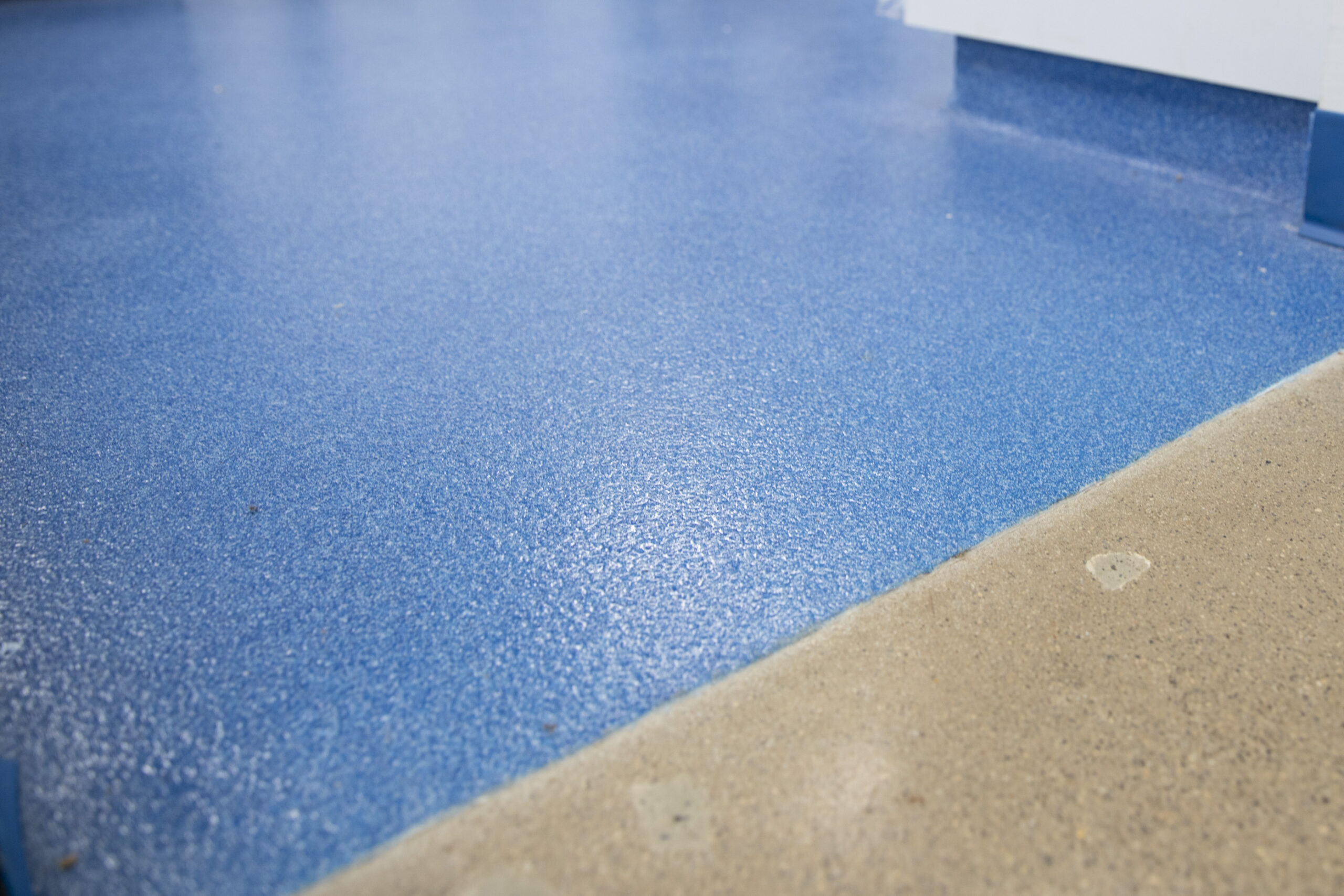 Dancer Concrete Design installed 1,200 square feet of our TreadWell Decorative Quartz epoxy system in Handel’s kitchen area. A Urethane Mortar base coat was installed for additional durability. Their signature blue was chosen for the quartz broadcast mix, bringing in a fun pop of color that is anything but vanilla. During installation, we built 220 linear feet of integral cove around the cabinetry bases to create a seamless transition between the floor and vertical spaces. Our Decorative Quartz system provides slip- and impact resistance, making it a sweet choice for this ice cream kitchen.