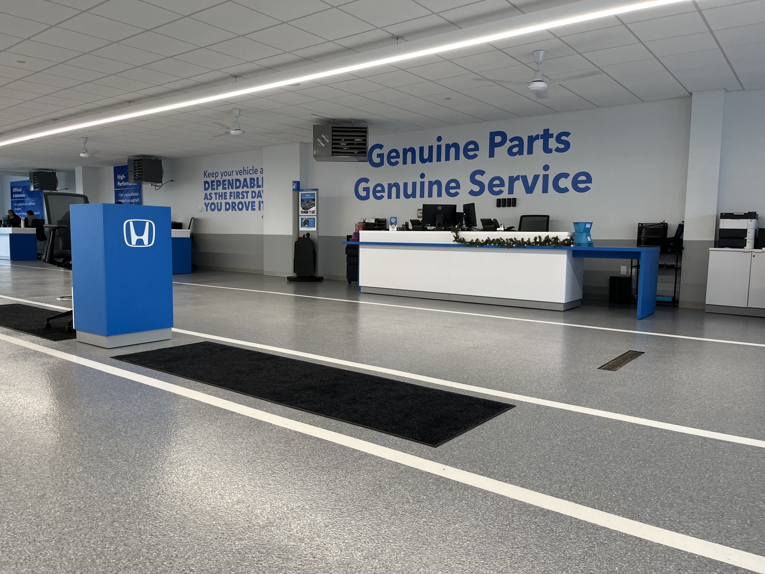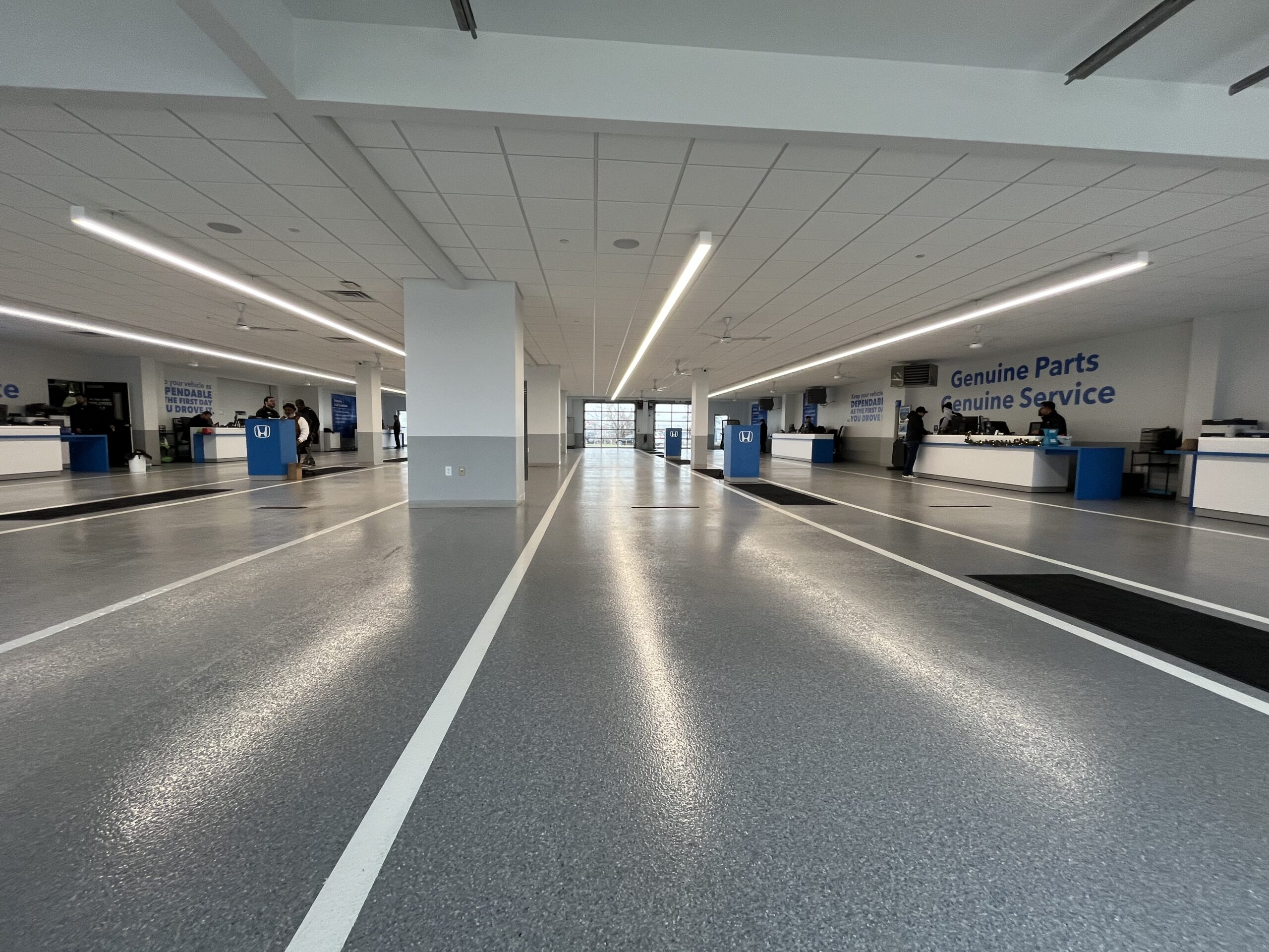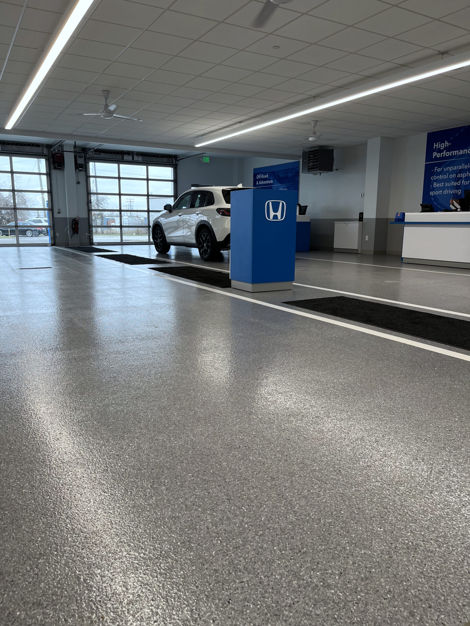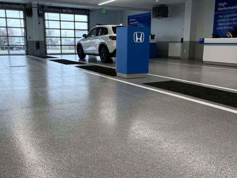 DANCER installed our TreadWell Decorative Chip epoxy flooring system in the renovated Service Center Reception for a local car dealership. The space included existing and new concrete slabs that our Team prepared to create a cohesive and seamless floor. A Basalt flake blend was chosen to complement the dealership’s branding, with a gloss top coat and grit additive for abrasion resistance, and finished with line striping for a neat, clean, and organized appearance.