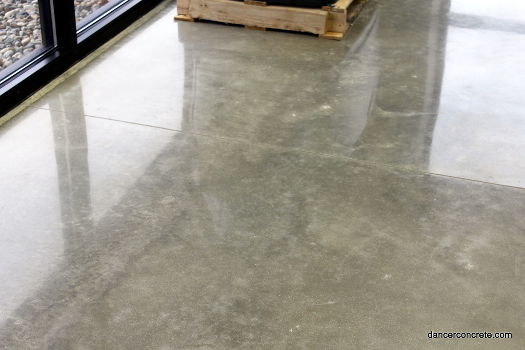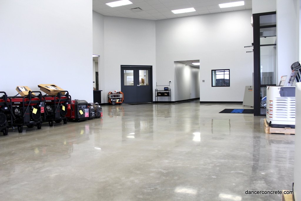 The sales room was 1,076 square feet and included some cracks and joints that needed to be filled. Dancer Concrete Design used a warm stone color, densified, and polished the floor to a 400-grit level 1 shine. For the 544 sq. ft. parts room, we cleaned the floor with the scrubber and then densified to further protect the concrete.
