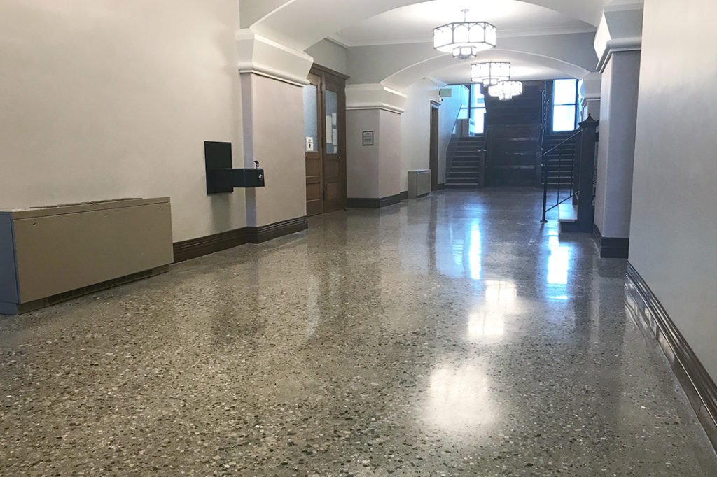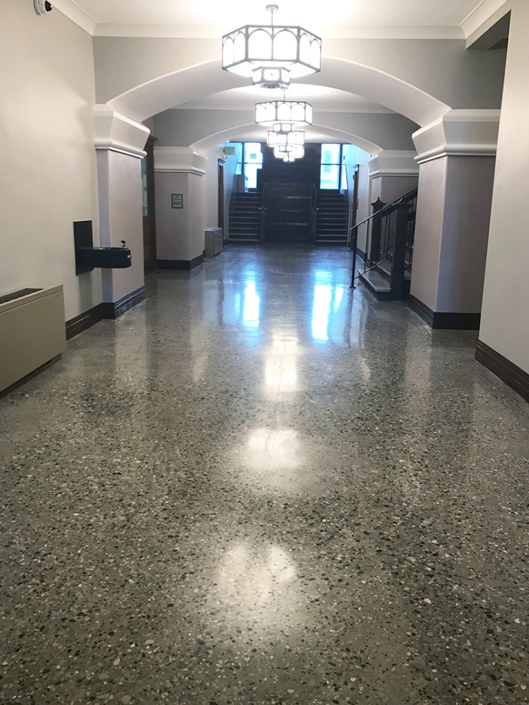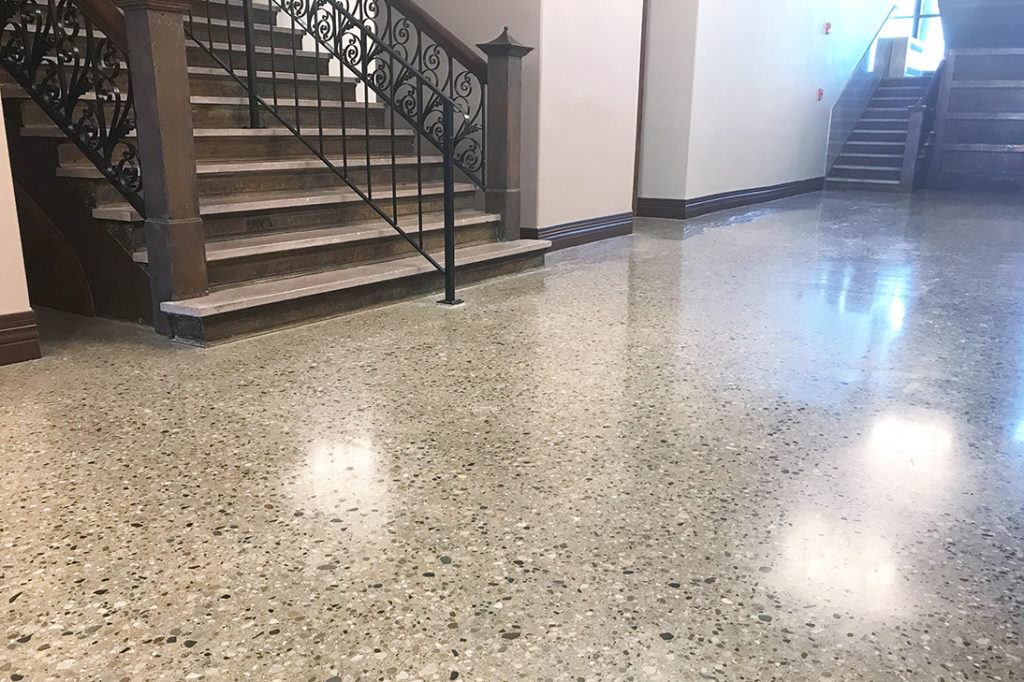 What is one to do with concrete floors that were poured between 1875 and 1895? Some may say, “Cover them up,” but the team at Viridian Architectural Design proclaimed, “polish them up!” Although unique in their pour style and aggregate exposure, the floors in Fulton County Courthouse located in Rochester, Indiana were in dire need of some T.L.C.