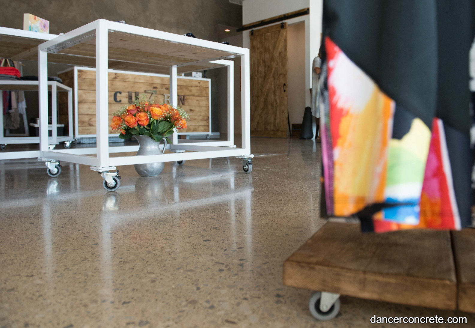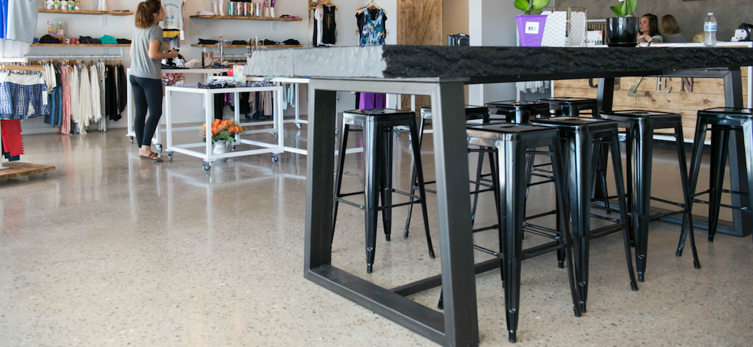 Fusion Yoga’s style is Swedish/modern, and Celeste was looking for a clean and durable flooring system to complete the vibe she was anticipating. Our team installed polished concrete floors in the boutique area in front and in the hallway leading to the yoga studios. The space was originally carpeted, so our team started by removing remaining glue and patching some areas. Then, the polishing process began. Aggregate that was exposed ranged from Class B to Class C exposure, leaving a great textured look to the floor. After several passes, the space was complete with a 400-grit satin finish. To save the integrity of the original structure, the natural concrete coloring was preferred instead of a dye or stain.