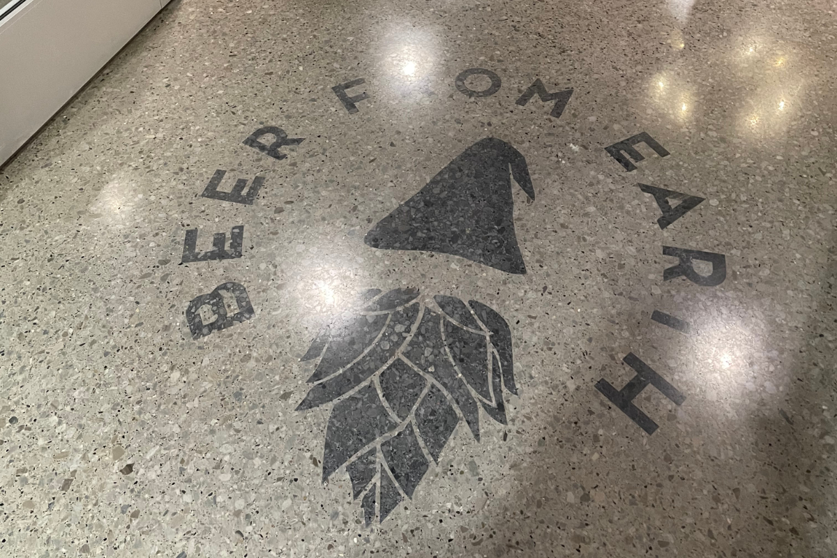 StrongTread Polish — Remodel was the perfect option for these existing floors. Additionally, we installed a penetrating dye logo at the entrance to the brewing area.
