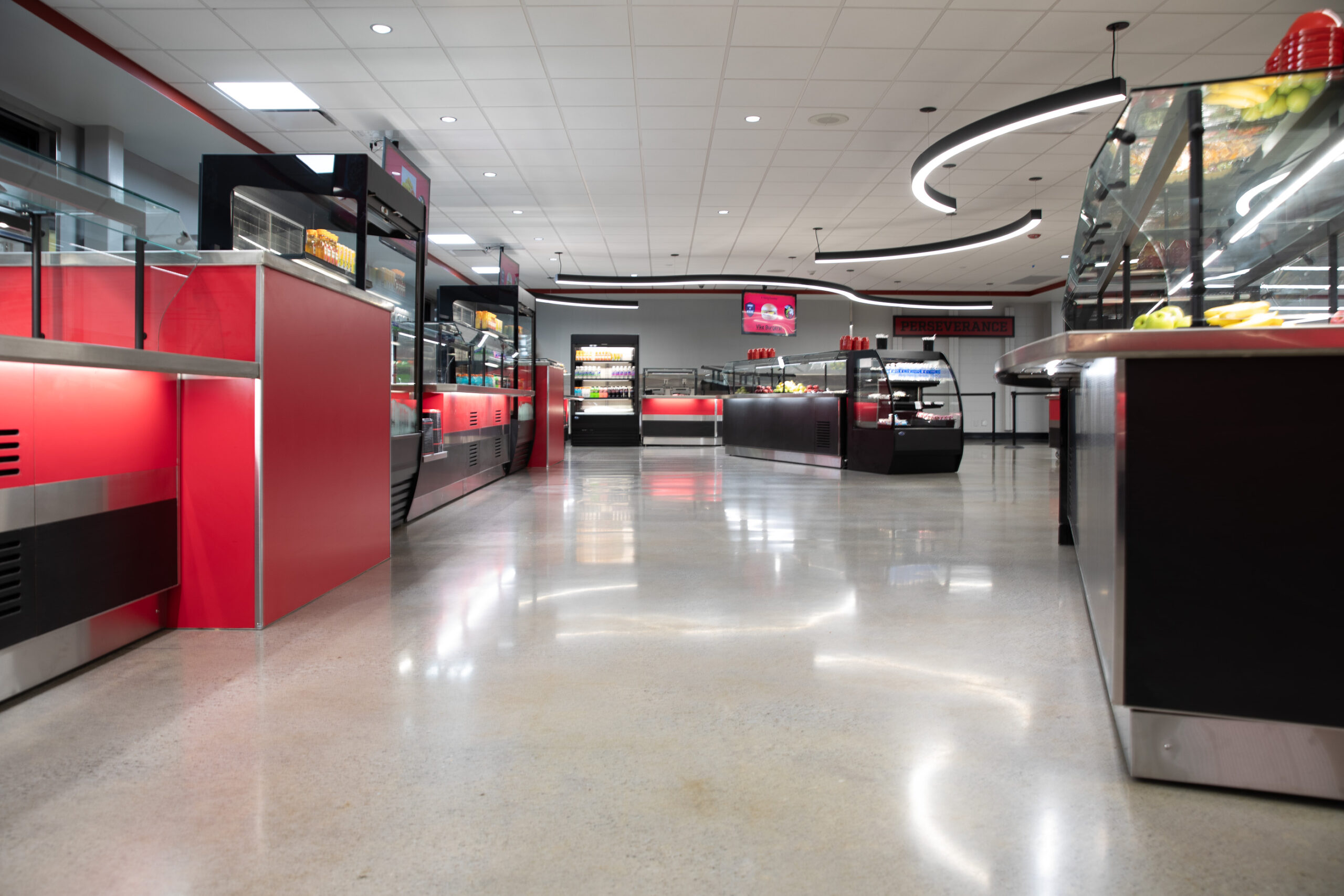 The school name and mascot name were dyed along opposite walls in the space, spanning a total of 51 feet. We used Onyx, Concrete Gray, and Ruby Red penetrating dyes in Huntington North’s school colors to bring a pop of color into the student’s gathering space.