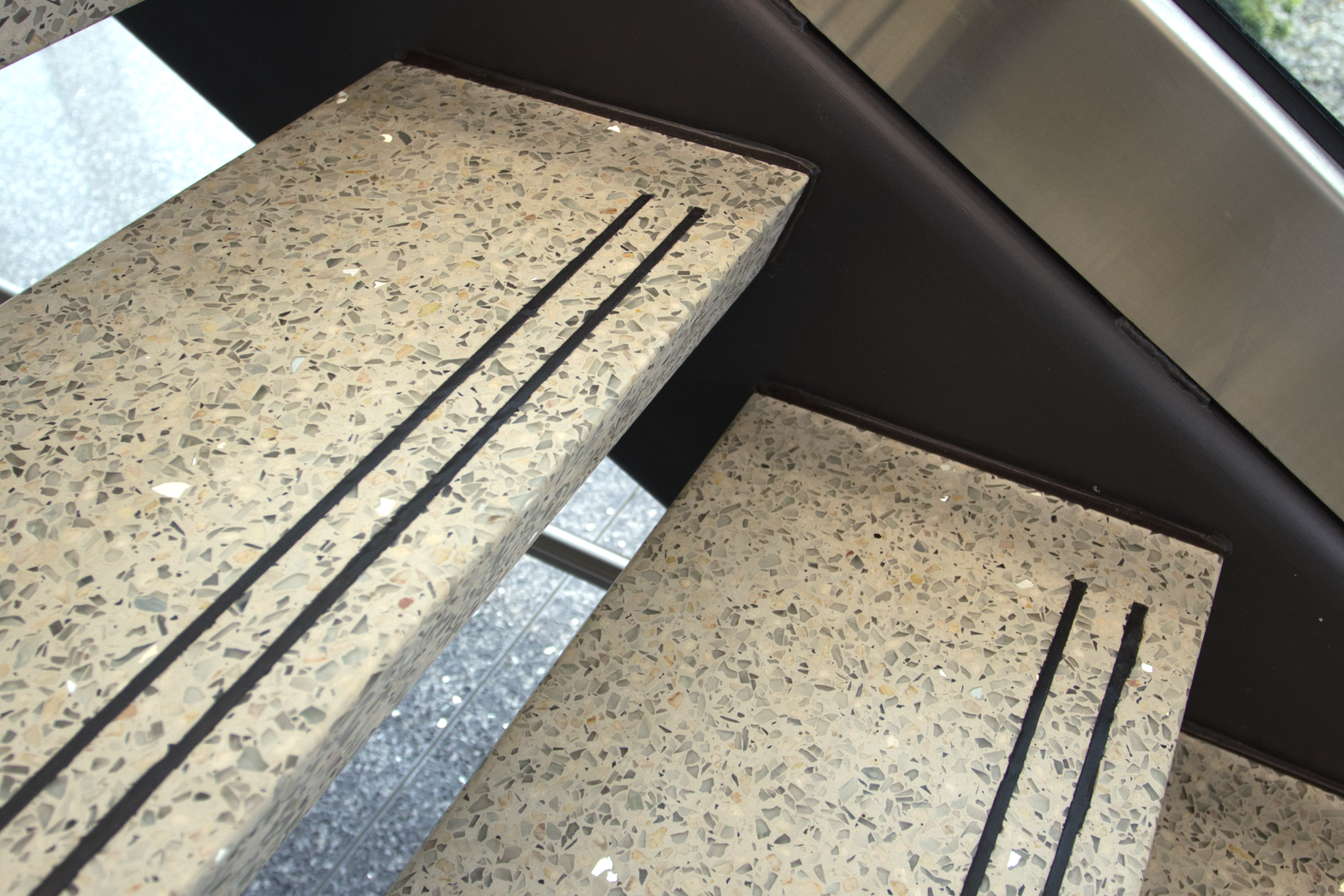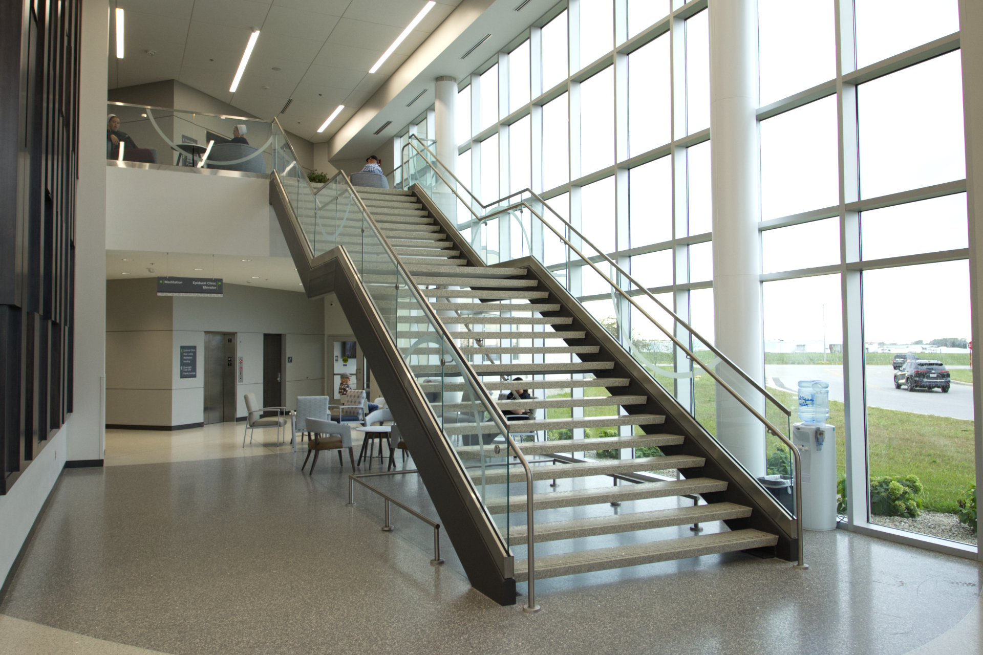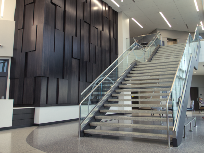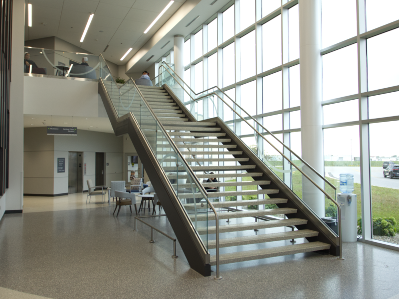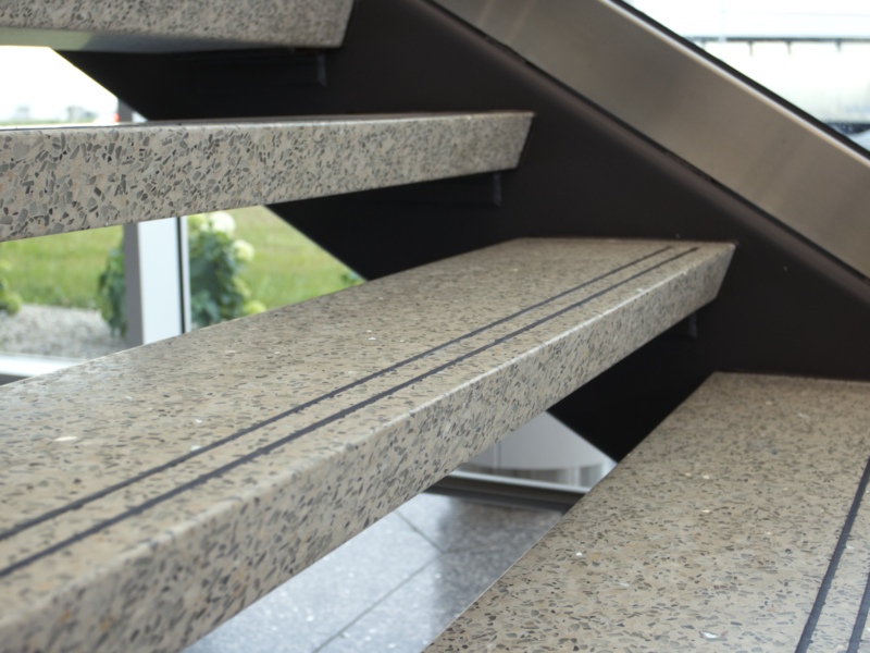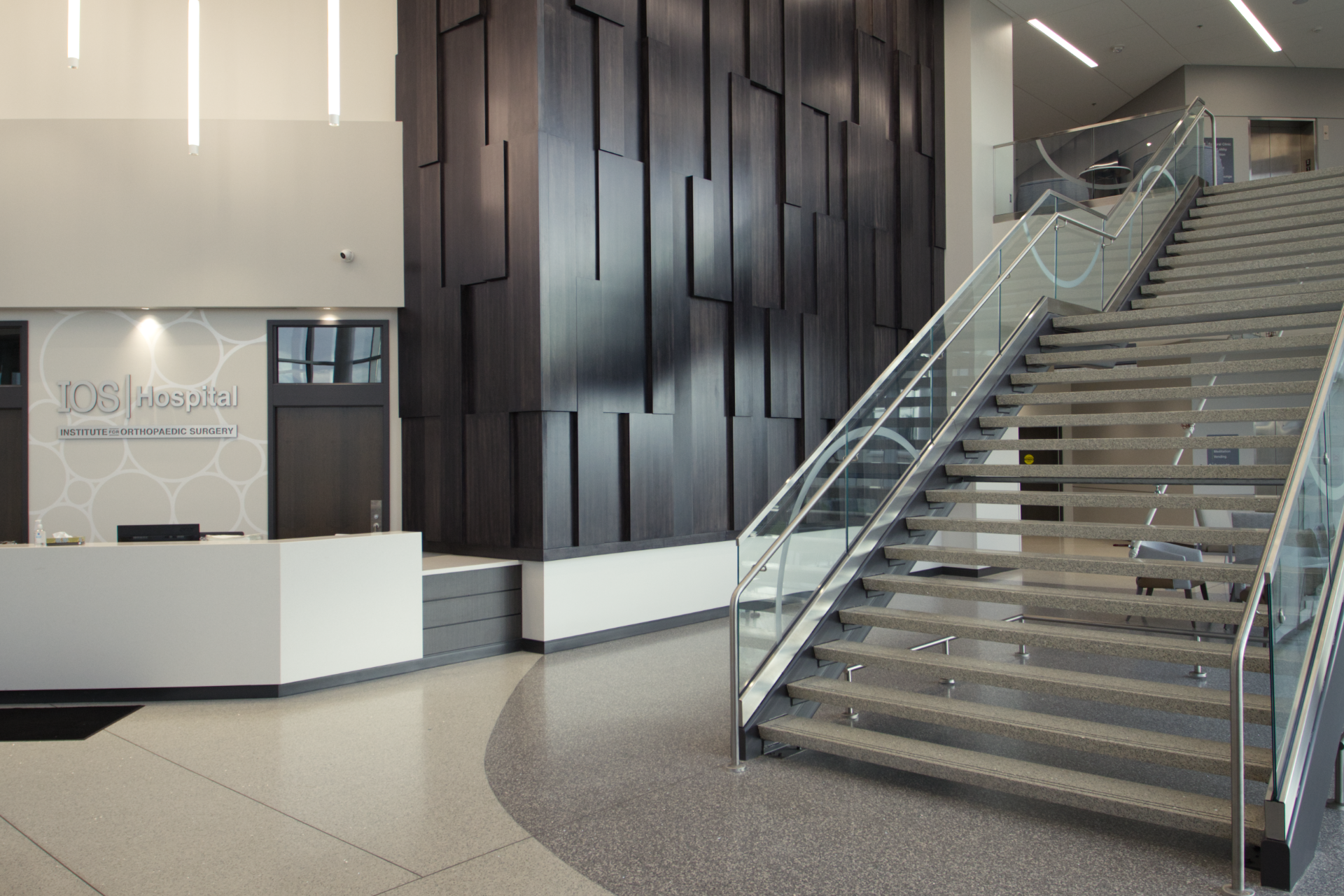 Institute For Orthopaedic Surgery (IOS), in Lima, Ohio, expanded their footprint recently with an addition. Dancer Concrete Design’s CAST Team poured and polished 26 terrazzo structural steps and a landing for the front lobby of IOS. The epoxy terrazzo stair treads are 8 feet long, 12 inches deep, and 3 inches thick, with a 12° nosing angle. Each tread has embedded steel reinforcement and two black urethane nosing strips across the top. A custom mix of marble chips, recycled glass, and broken mirror was chosen for the project. Once cast, the treads were polished to an interior step finish.