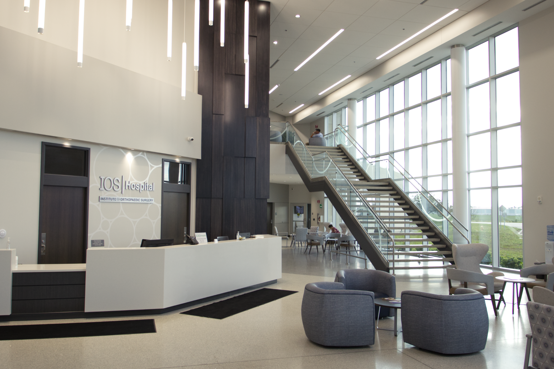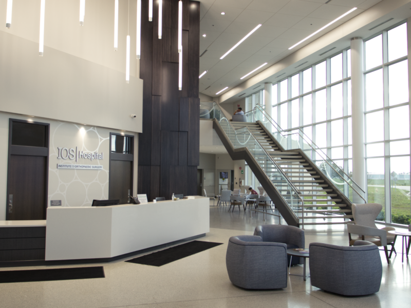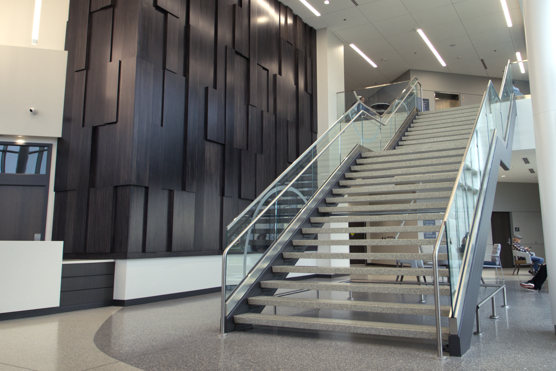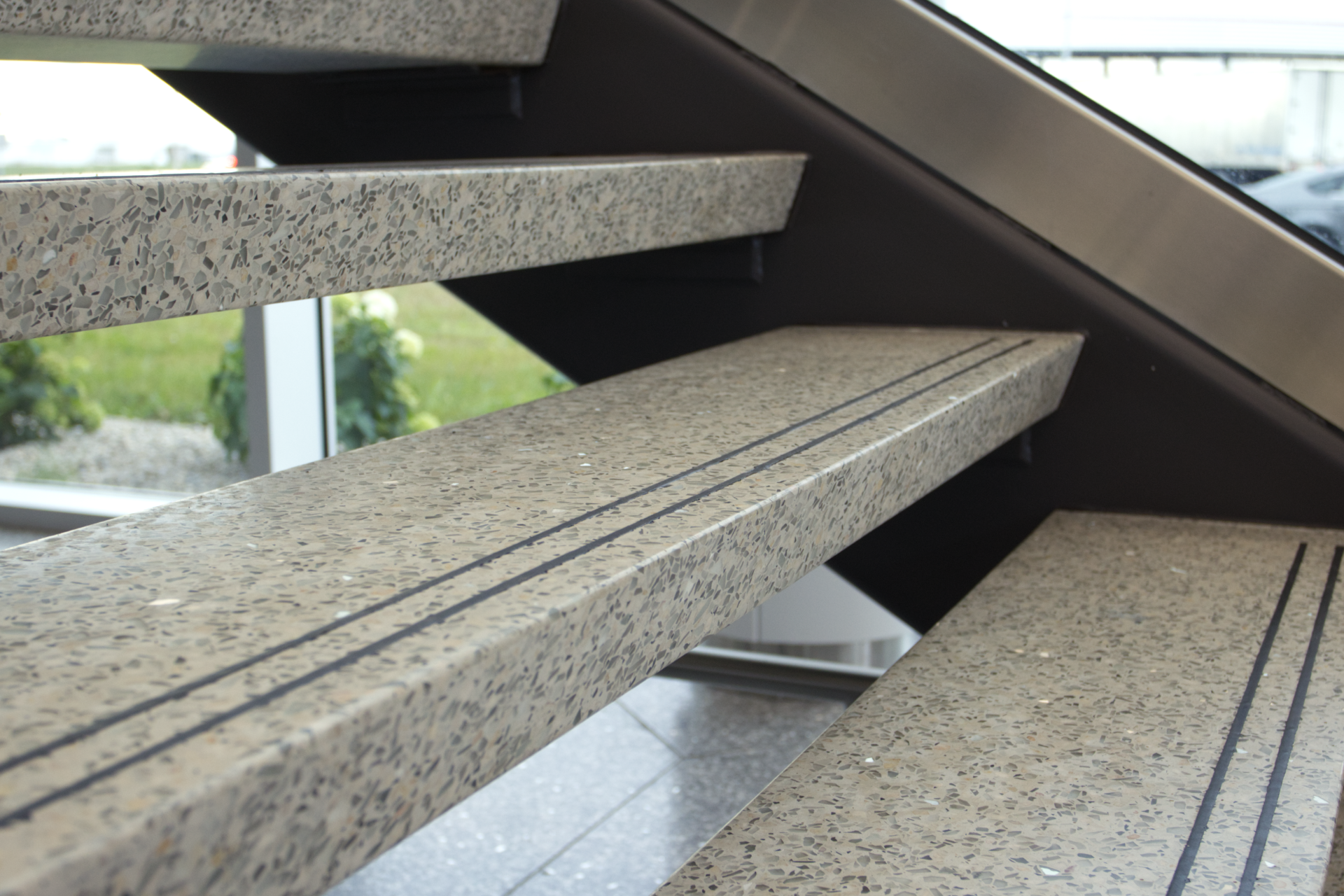 Institute For Orthopaedic Surgery (IOS), in Lima, Ohio, expanded their footprint recently with an addition. Dancer Concrete Design’s CAST Team poured and polished 26 terrazzo structural steps and a landing for the front lobby of IOS. The epoxy terrazzo stair treads are 8 feet long, 12 inches deep, and 3 inches thick, with a 12° nosing angle. Each tread has embedded steel reinforcement and two black urethane nosing strips across the top. A custom mix of marble chips, recycled glass, and broken mirror was chosen for the project. Once cast, the treads were polished to an interior step finish.
