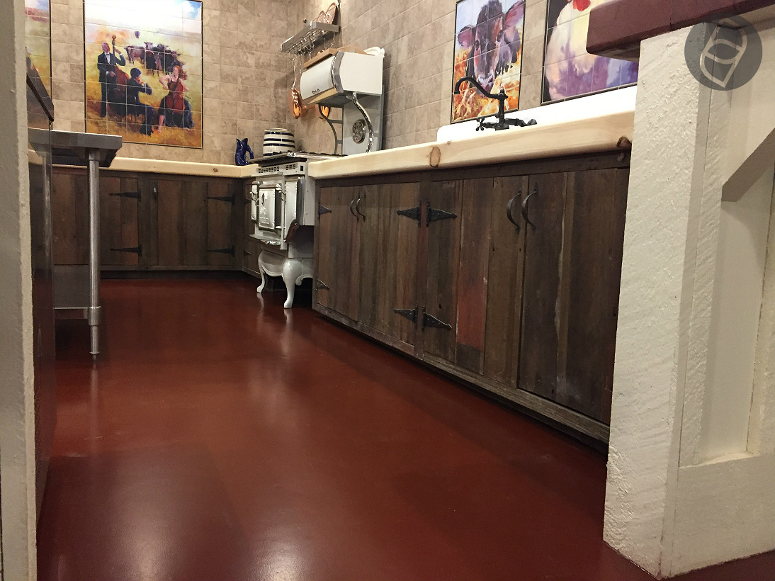 Dancer Concrete Design is no stranger to Joseph Decuis. In 2014, our Team completed polishing and staining work in their Farmstead Inn. Recently, they requested our services again – this time in their banquet area on the farm property. We provided a smooth epoxy floor coating in the color Merlot. The floor provides a statement in the space while also performing in functionality and low-maintenance upkeep. The color selection complements the style of the banquet area, as well as the rest of the property and brand. The floor received a satin finish and a final urethane coating to provide additional wear resistance. Our team finished up with the urethane application on a Thursday, and the space was ready for a wedding reception two days later.