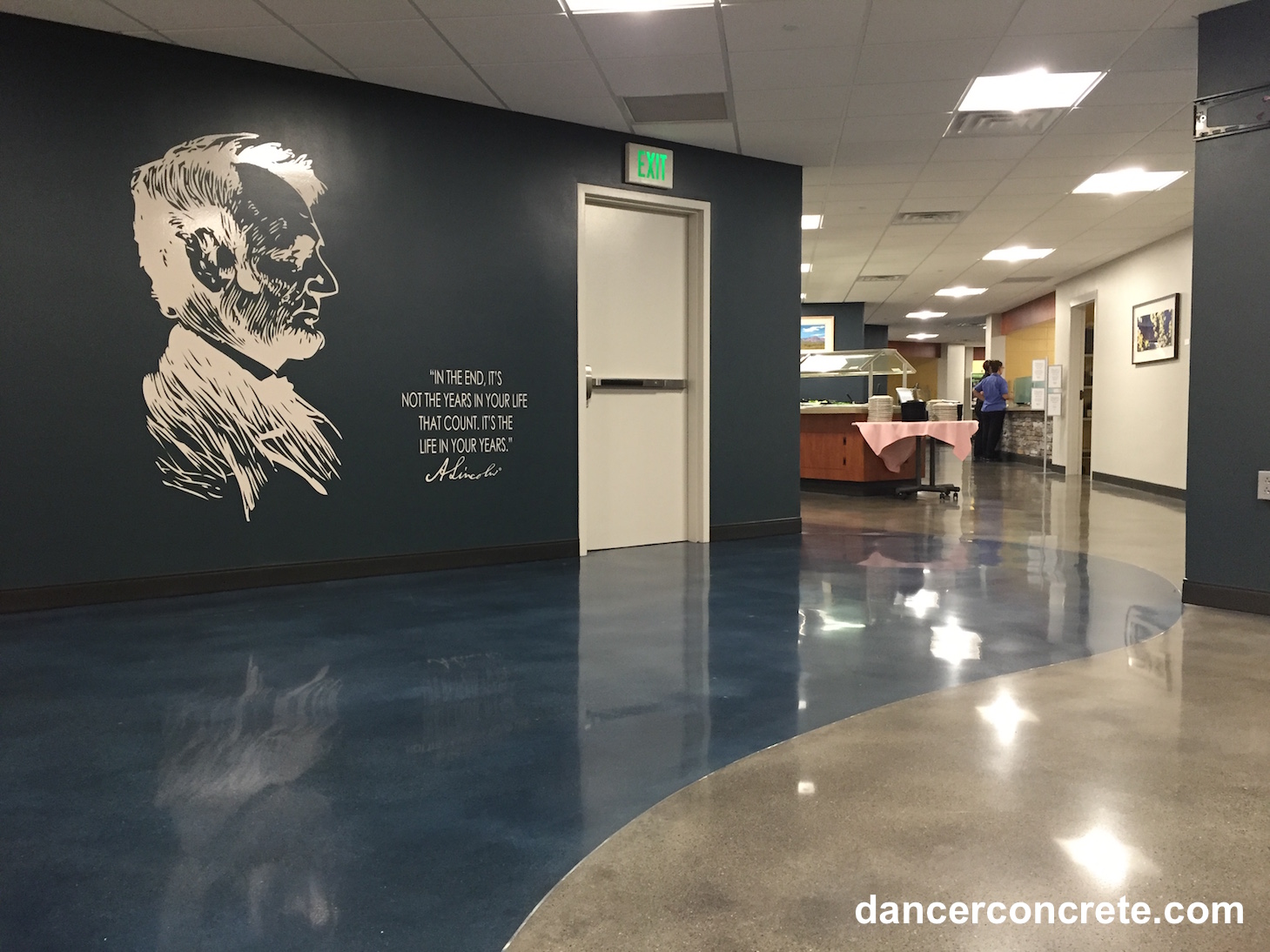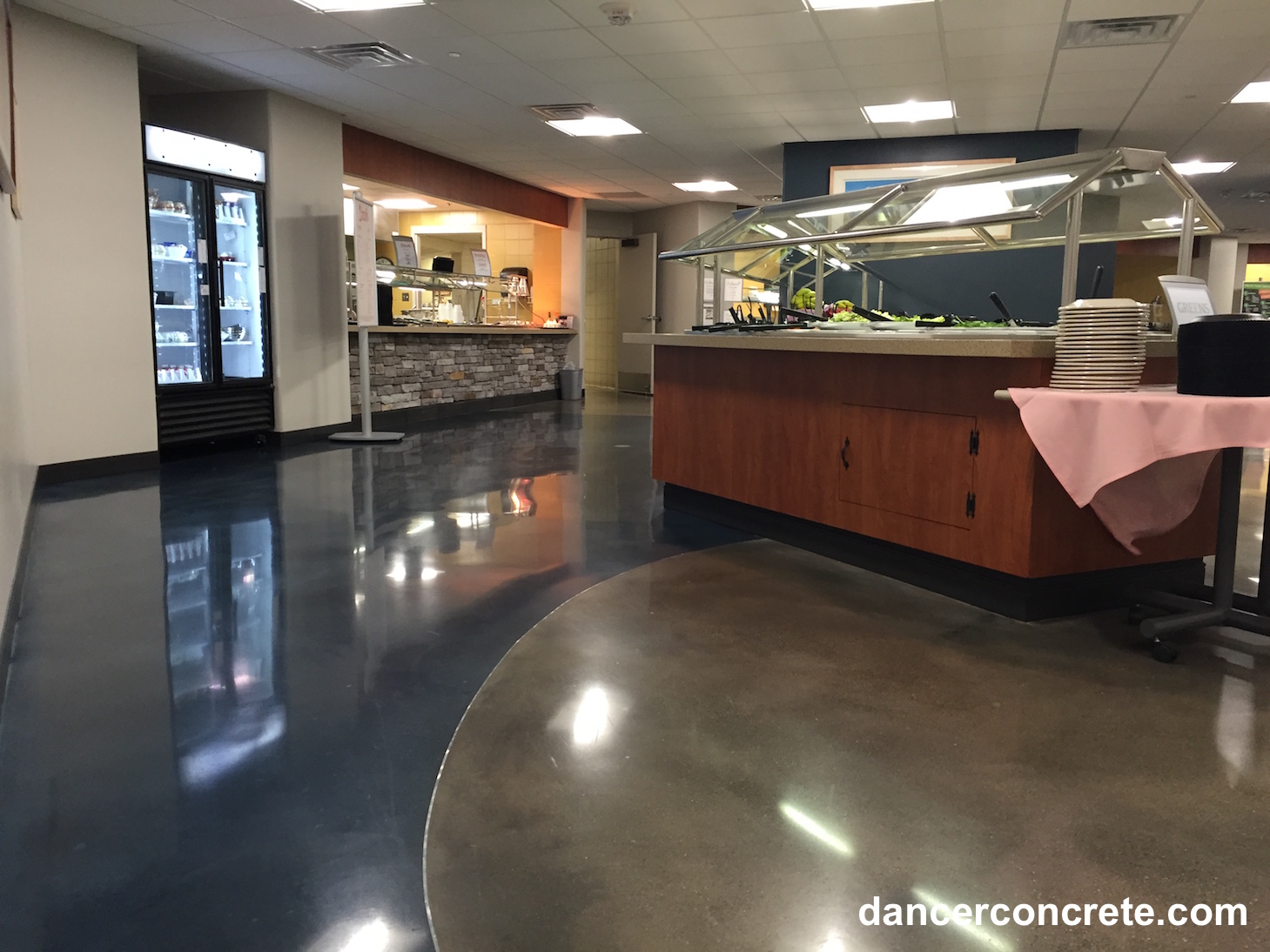We first noticed that the existing floor was in pretty rough shape. There had been ceramic tile in the space, and removing these old flooring materials left a surface that would probably not produce the look that was desired with regular concrete polishing and staining. A polishing-compatible overlay was the solution to this obstacle. Implementing this provided a uniform appearance to the floor. Terrazzo strips were used in the control joints of the floor and to separate the colored sections. Slate Blue Penetrating Dye and Soft Maple Reactive Stain were used to color the concrete overlay in the curved design seen in the gallery below. The polishing process was completed at an 800-grit finish with Class B aggregate exposure.