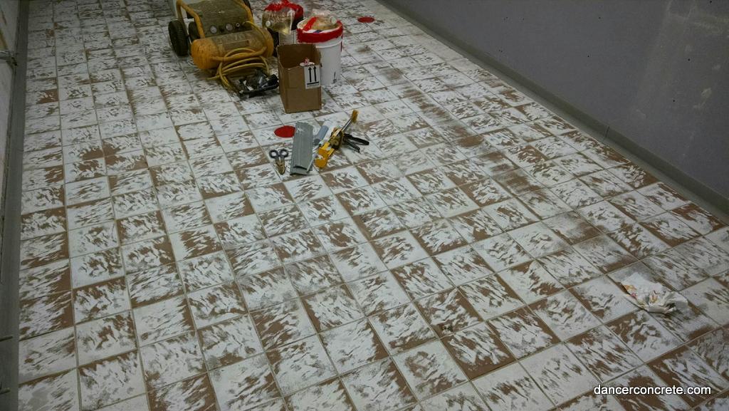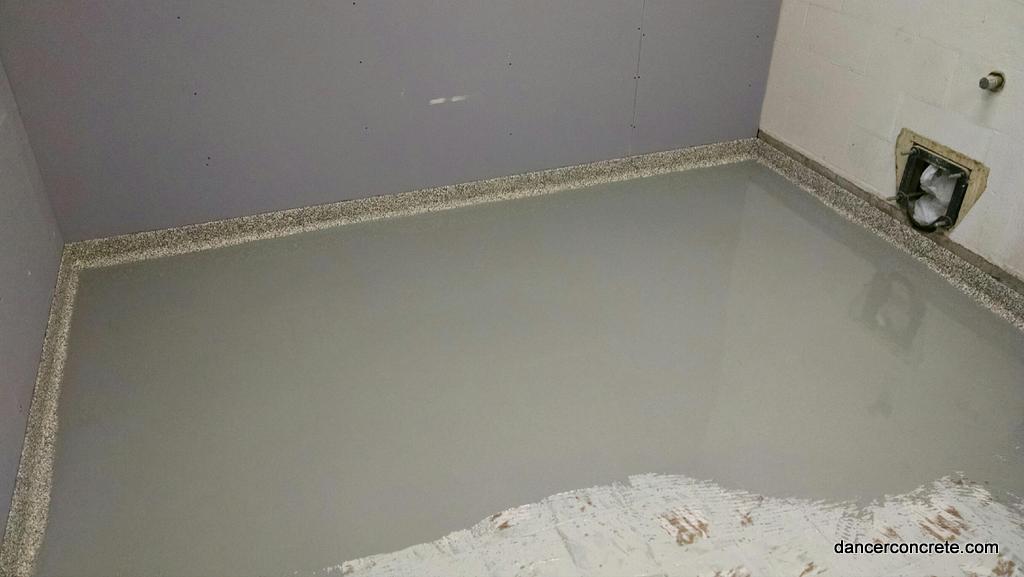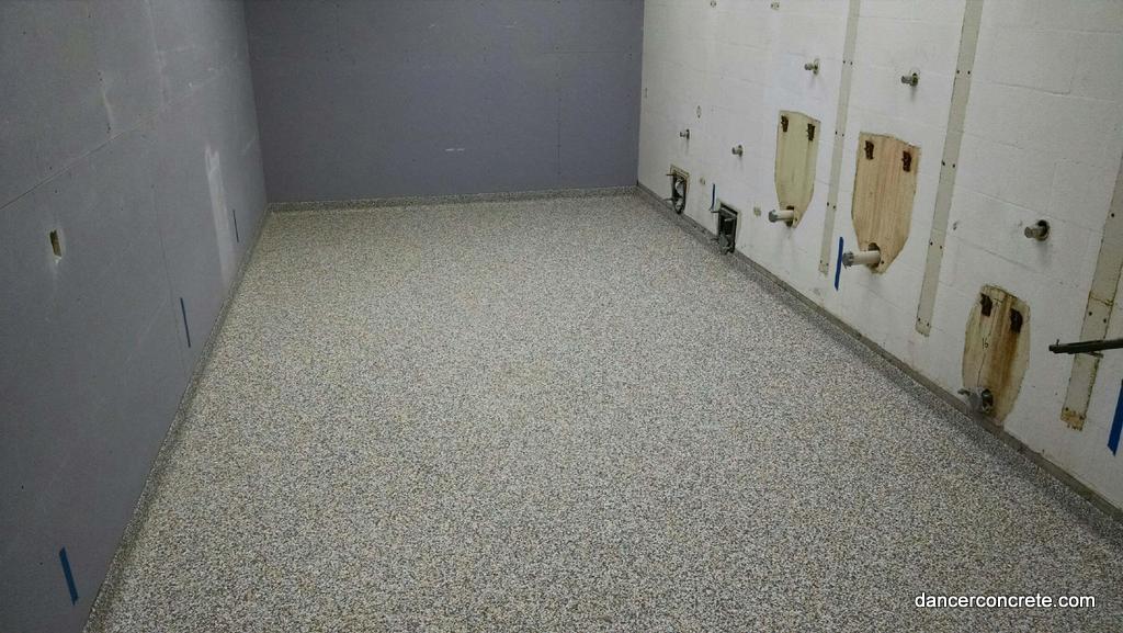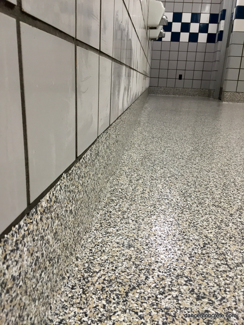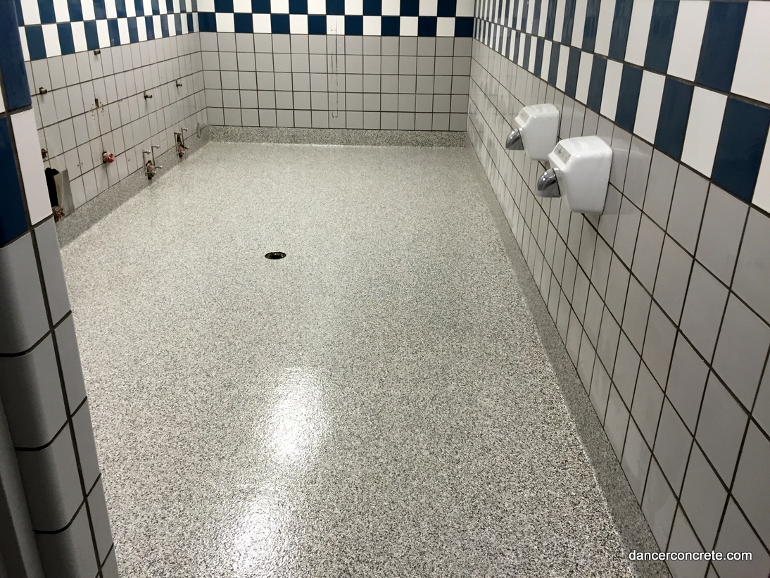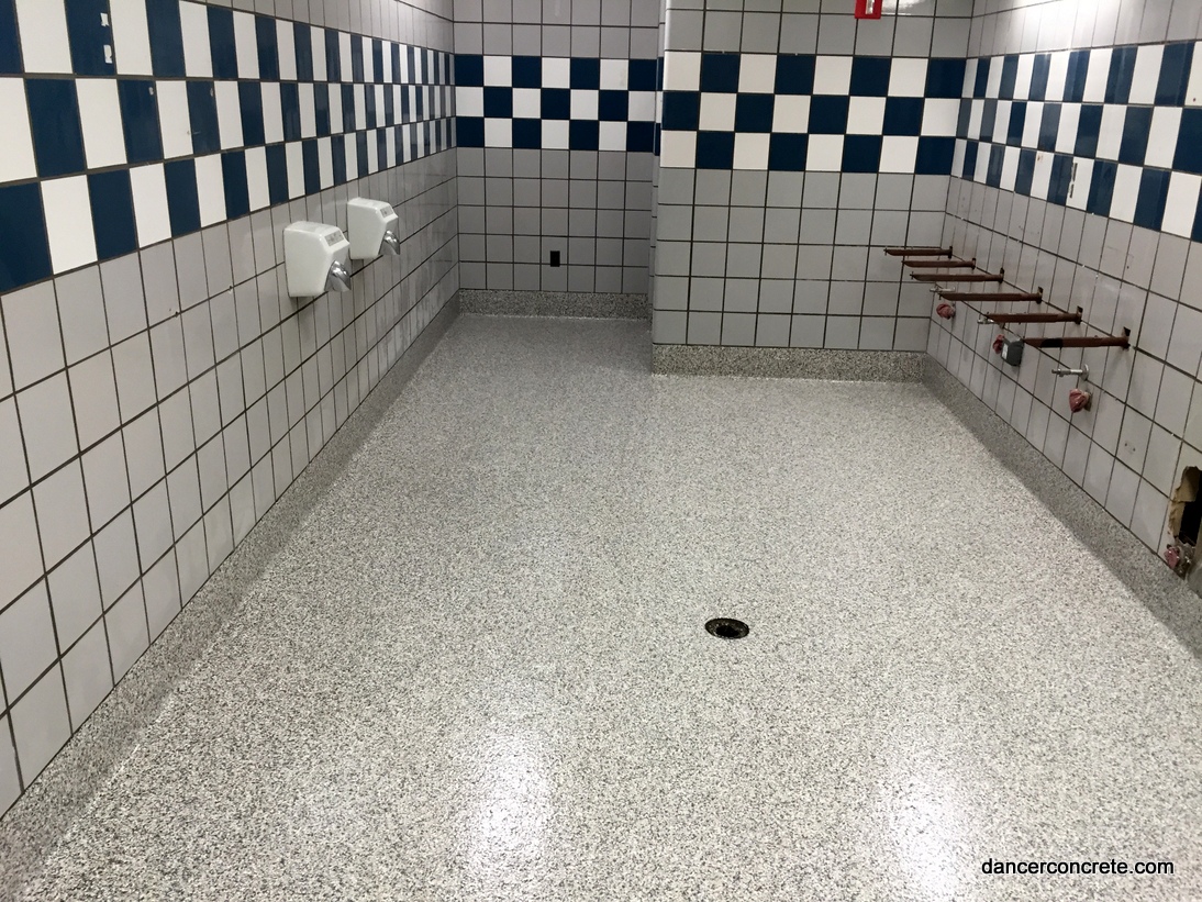 We start the installation by applying a base coat of medium grey epoxy. A chip blend called β€œOystershell” is then broadcast into the floor. The chips create the slip-resistant flooring. A final topcoat is applied after the chips have been scraped to seal the floor. For each bathroom floor, we also installed an integral cove. This means that we took the epoxy and applied it vertically around the edges of the room. This helps protect the walls from moisture and allows the bathroom to be hosed down. The 5β€³ cove is applied with the same steps as the floor: base coat, chips and top coat. The final step is to apply an urethane gloss finish coat.