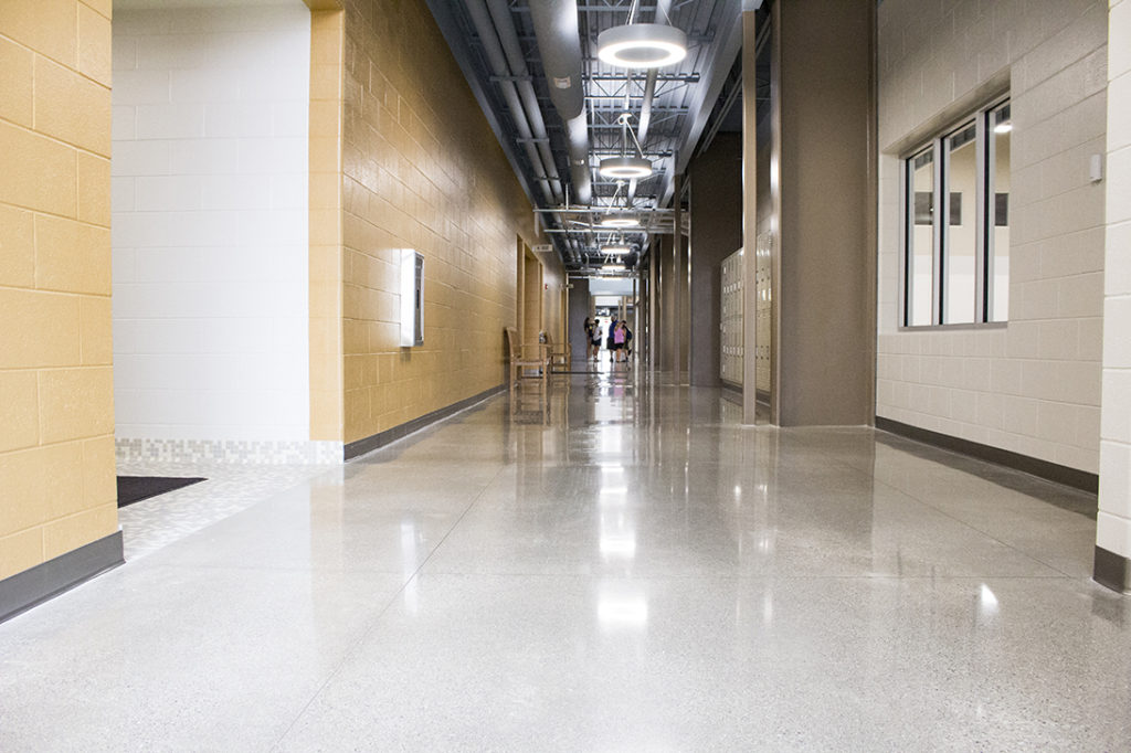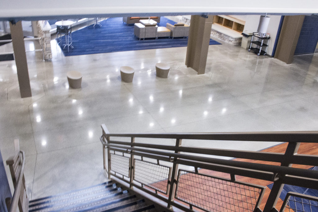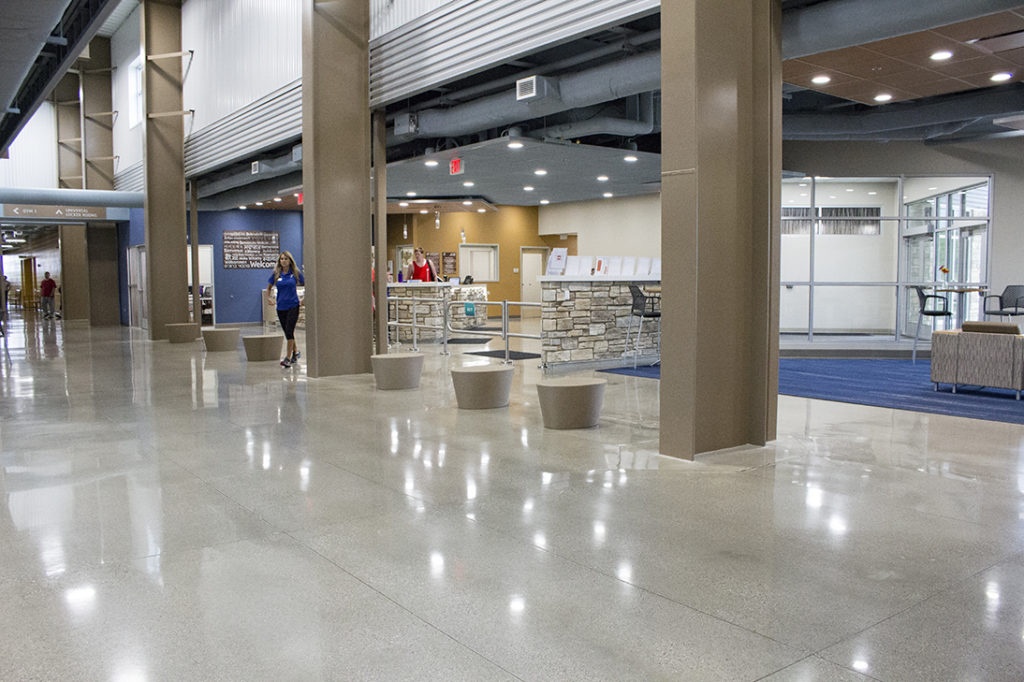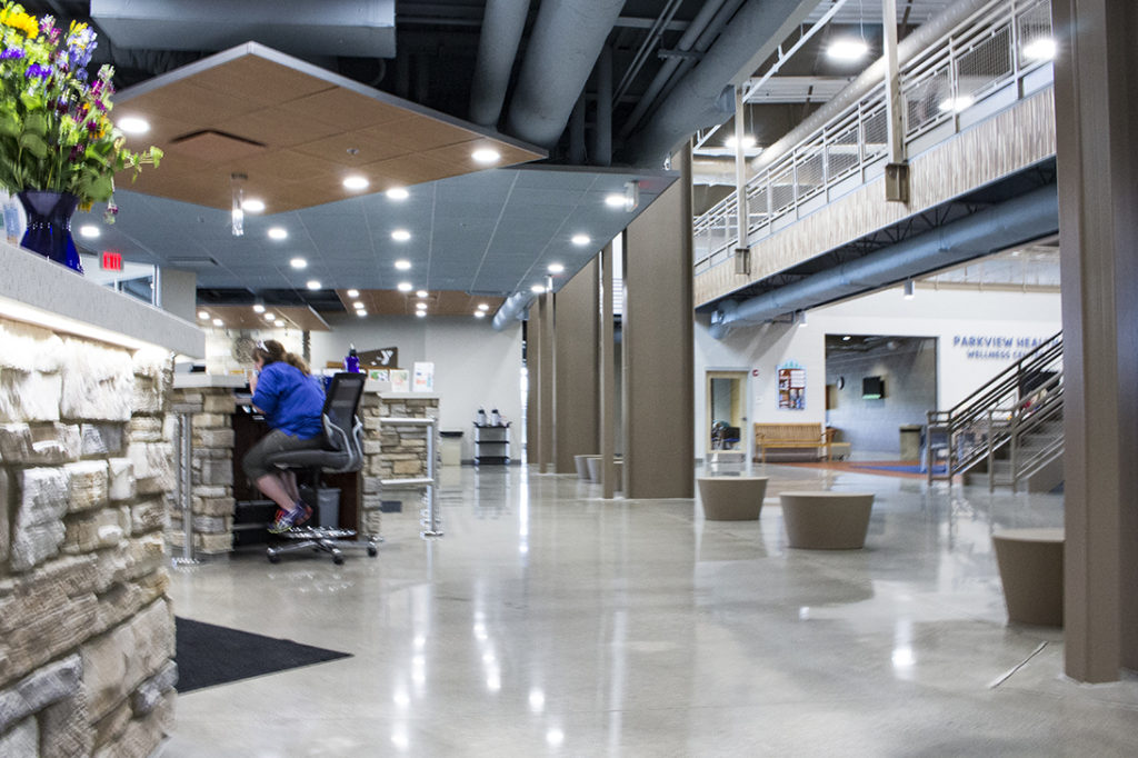 The brand new Jackson R. Lehman Family YMCA in Fort Wayne, Indiana will have you motivated to move. The team at Bona Vita Architecture knocked one out of the park with the designs on this quality YMCA project by creating a space that makes you feel energized as soon as you step inside the door. This modern facility has everything you need to endure a successful workout including: state of the art equipment, gyms, a track, a swimming pool, and fun spaces to hang out for kids and adults. The entire design enhances your mood and encourages health and fitness. Along with great product selections, layout, and finishes throughout, the design team also decided to sport a durable yet beautiful polished concrete option with a salt and pepper aggregate exposure for the main flooring.