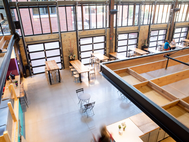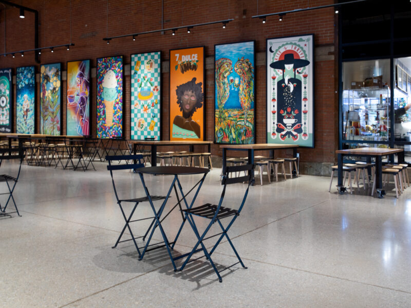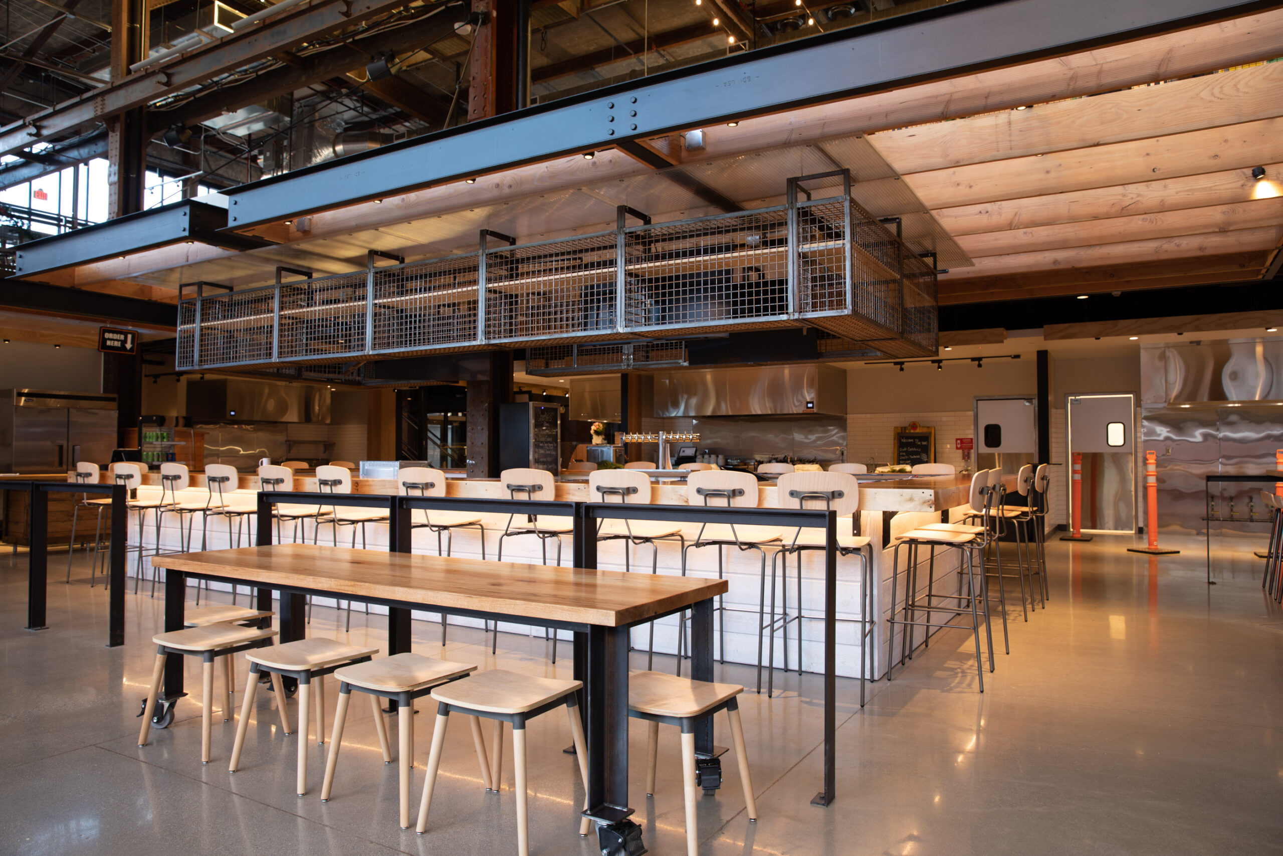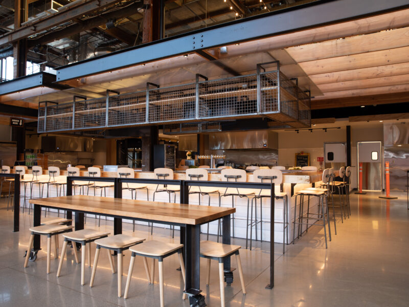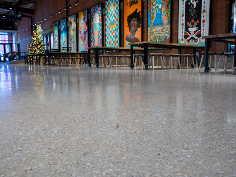Over 17,000 square feet of concrete floors were polished in the main food courts and adjoining common seating space by Dancer Concrete Design. We installed our StrongTread Classic system in the food courts, giving the main space a consistent salt-and-pepper finish. In the adjoining seating area, StrongTread Deep was installed, bringing out larger stones in the floor to define the common space. The polished concrete floors complement the industrial architecture of the Electric Works campus and provide an easy-to-maintain flooring system that will last for years to come.
