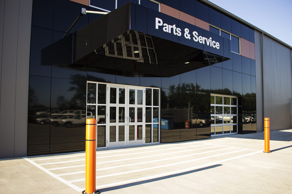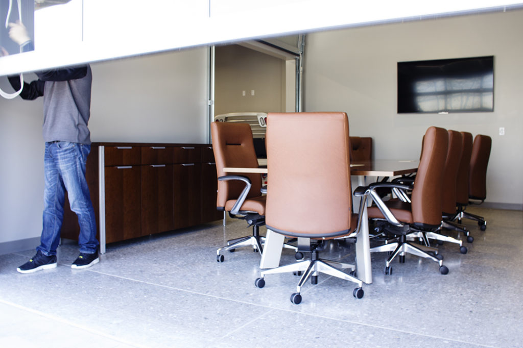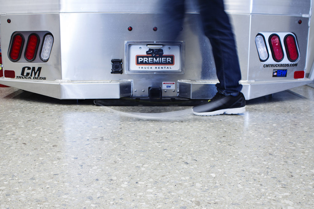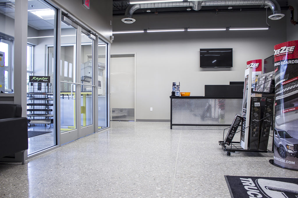 Premier Truck Rental, in Fort Wayne, Indiana, had designer Frank Souder on their side to ensure that their interior renovation was designed right with durable yet attractive finishes. The facility now boasts a deep concrete aggregate exposure which appears to lay down a handsome and visually rugged base for this industrial-modern interior. The cooler gray colors mixed with diamond plate metals are warmed up with Premier’s orange accent color, which was incorporated into the space through wood tones, fabrics, and signs. Briner was the builder and general contractor on this project, and they didn’t leave any details undone. They made a wise choice by bringing the Dancer Team in to install our StrongTread Polish – Deep, which shaves off 1/4” of the concrete and leaves behind the large aggregate pattern. Exposing large aggregate is always a nice surprise and can give your interior texture and interest.