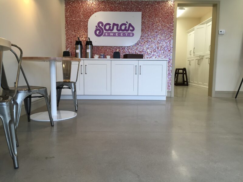 Our team at Dancer Concrete Design recently installed polished concrete floors for Sara’s Sweets, a new bakery in Lima, Ohio. Sara Anderson and her team bake gourmet cupcakes including tasty and unique flavors such as Cappuccino Chip, Churro, and Maple Bacon. They offer a cupcake flavor calendar highlighting when your favorite flavors will be available and some everyday favorites. Sara’s Sweets also specializes in catering cupcakes for weddings and other events. When thinking about design, Sara was looking for a neutral background for her colorful cupcakes.