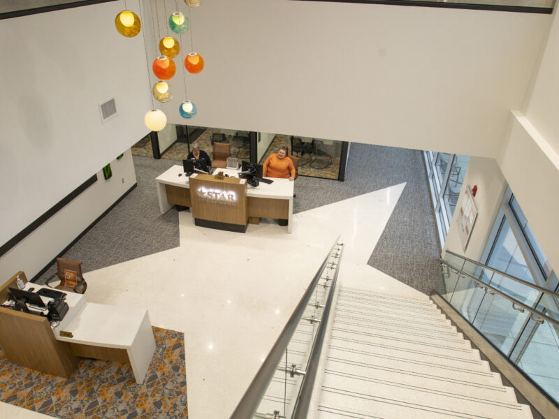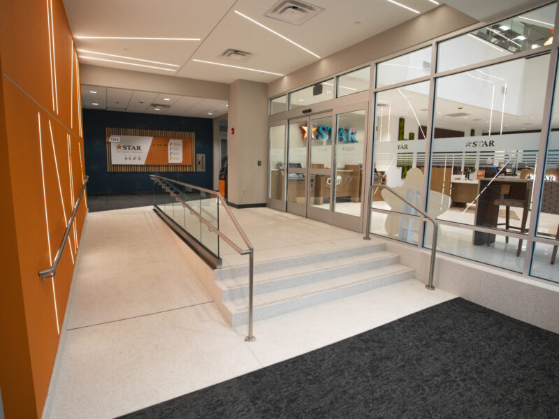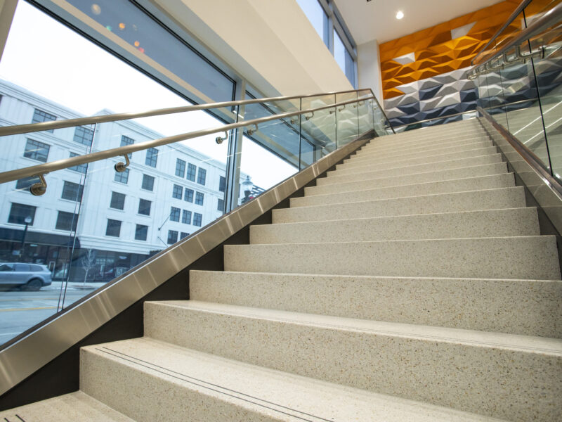 STAR Financial Bank has opened their new headquarters to join the downtown Fort Wayne skyline with their seven-story building. The entryway and lobby feature terrazzo flooring installed by Dancer Concrete Design and 30 precast terrazzo stairs made by CAST Terrazzo Products.