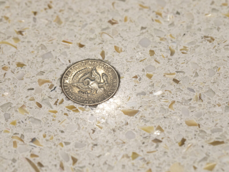 The customer chose a custom blend of glass, white marble, and mother-of-pearl aggregates for the terrazzo called “Shoot For The Stars.” The lobby terrazzo is placed in the shape of a star to match the bank’s logo and finished to a stellar shine. After final finishing, 32 coins, including pennies, nickels, dimes, quarters, half dollars, and one dollars, were inlaid within the terrazzo.