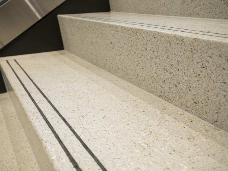 The flooring seamlessly transitions up the stairways with our CAST Rise-Run Treads. These “L”-shaped treads eliminate any gap between the outward lip of the stair tread and the riser, and the stairs match the terrazzo mix used in the flooring pour to create a cohesive space in STAR’s HQ.