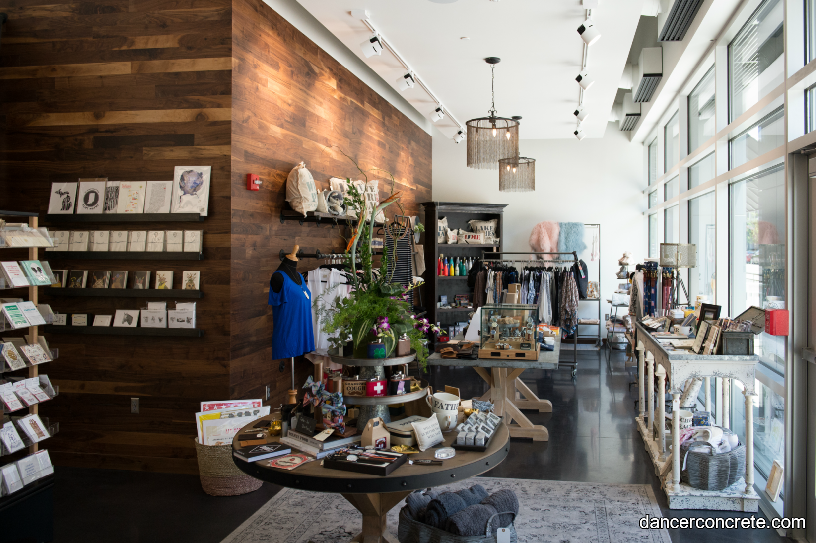 Since the ASH Centre is new construction, the concrete floors our team started with were freshly poured. The floor was ground down to expose fine/sand aggregate. The owners chose Midnight Black Penetrating Dye to color the floor. This darker color really enhanced the space by highlighting other natural elements in the room, such as the wooden accent wall that can be seen in photos below. After the dye was applied,  the concrete was sealed and the final passes were completed to bring the floor to a 400-grit satin finish. The new dyed and polished concrete floors really complete the look of the space and give the boutique a clean, sophisticated vibe. The architect for this project was MSKTD, an architectural firm based in Fort Wayne and Indianapolis.