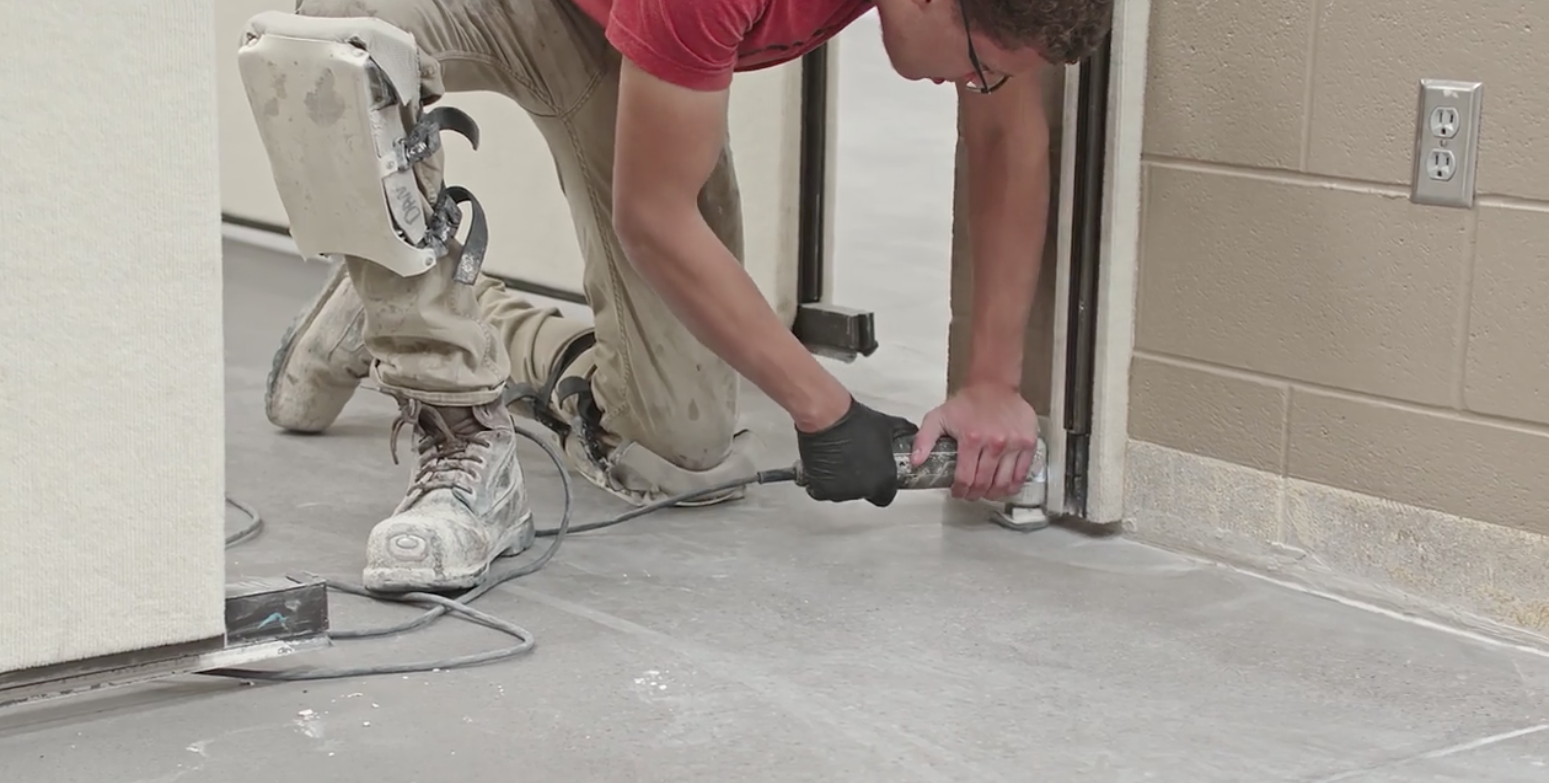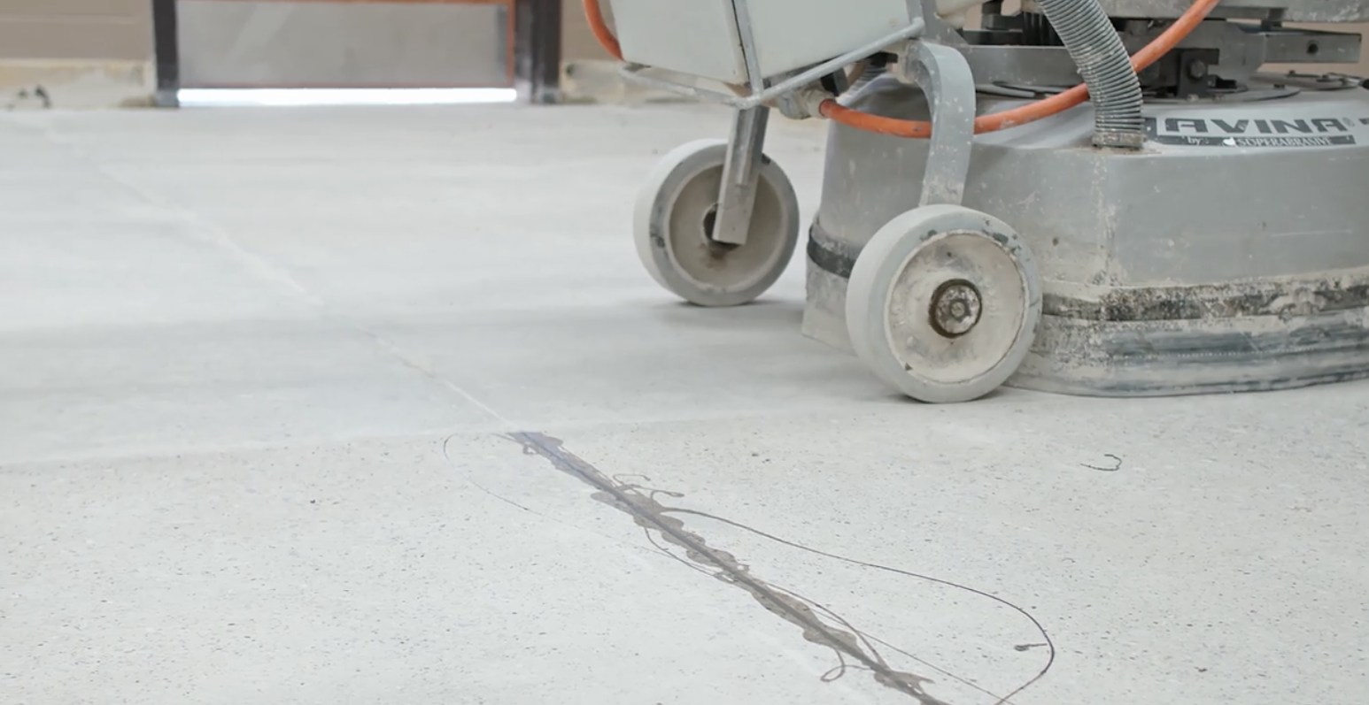 Areas next to walls and doorways are honed and polished as the rest of the floor is, but these sections are done with handtools.