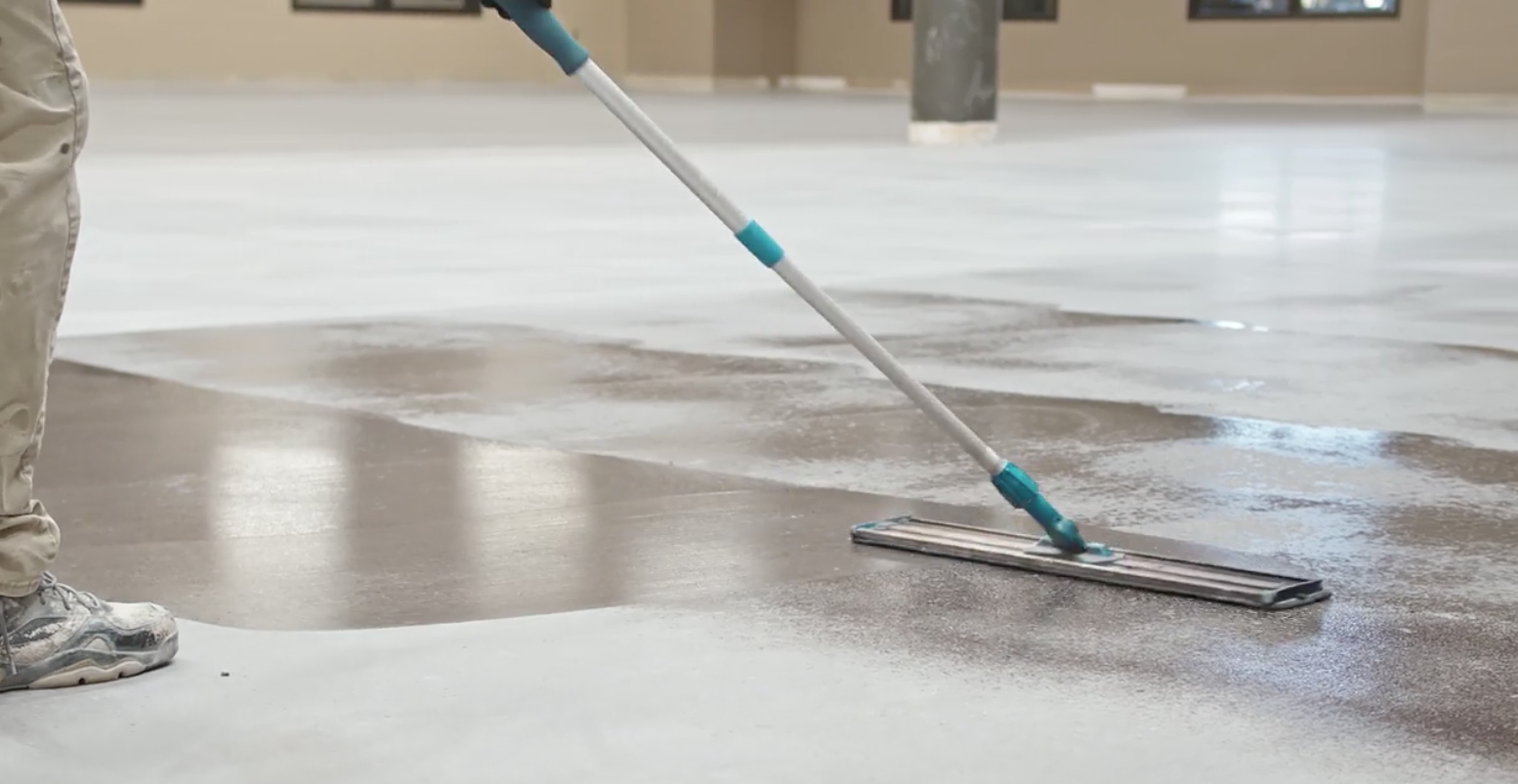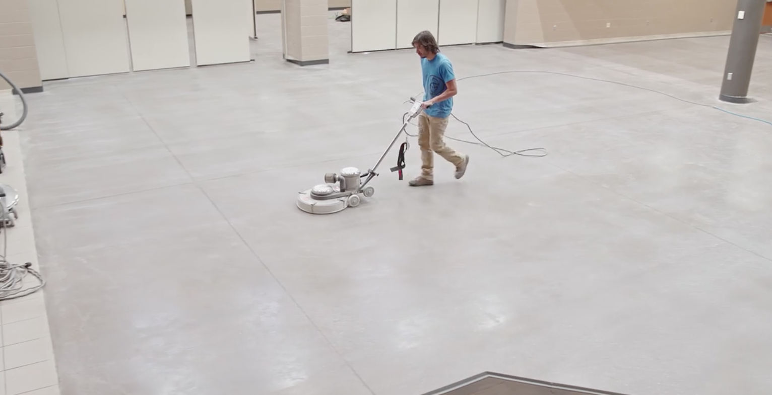 We manually spray densifier and stain guard onto the floor, as well as color if it’s requested. The products are agitated into the surface.